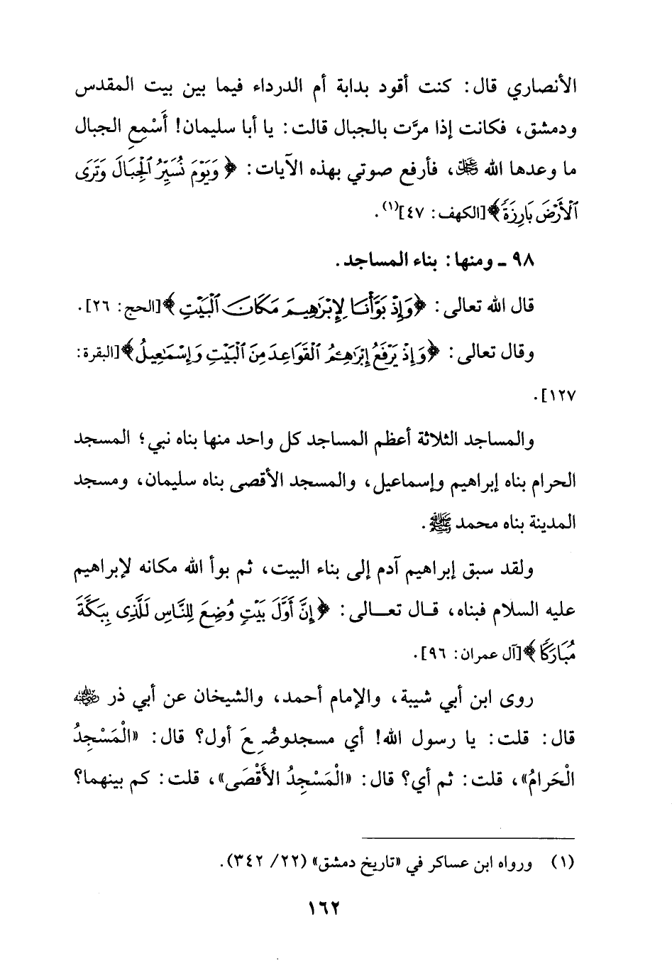 والمساجد الثلاثة أعظم المساجد كل واحد منها بناه نبي؛ المسجد الحرام بناه إبراهيم وإسماعيل، والمسجد الأقصى بناه سليمان، ومسجد المدينة بناه محمد - رضي الله عنه -.