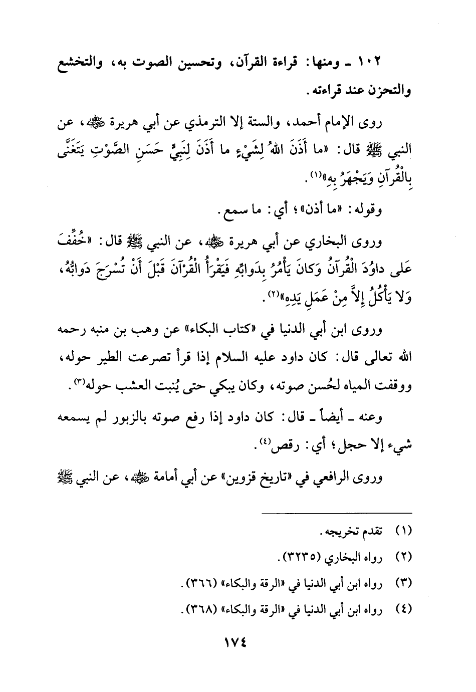 102 - ومنها: قراءة القرآن، وتحسين الصوت به، والتخشع والتحزن عند قراءته.