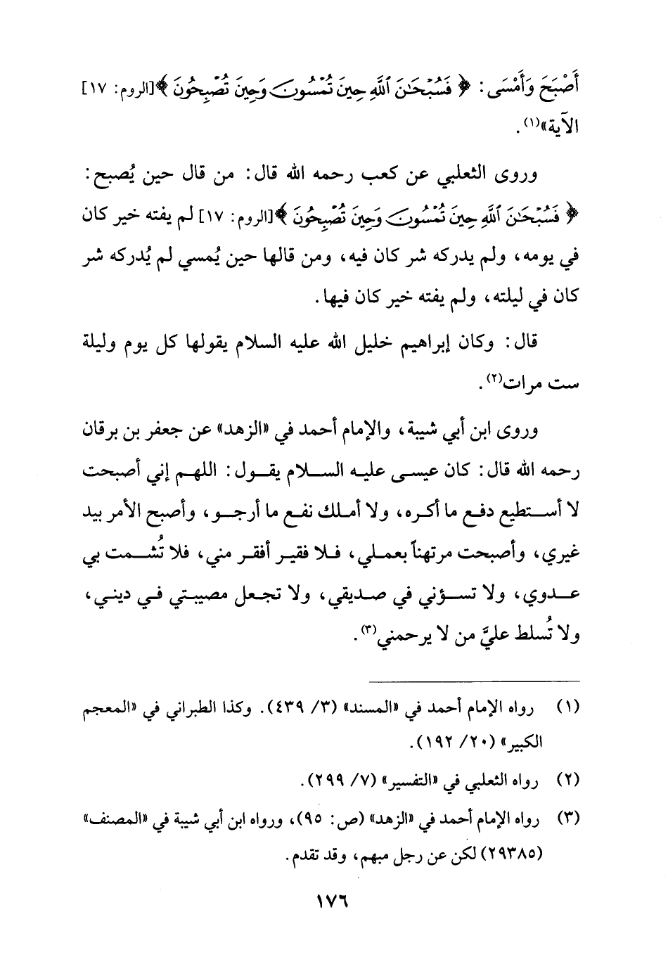 وروى الثعلبي عن كعب رحمه الله قال: من قال حين يُصبح: {فَسُبْحَانَ اللَّهِ حِينَ تُمْسُونَ وَحِينَ تُصْبِحُونَ} [الروم: 17] لم يفته خير كان في يومه، ولم يدركه شر كان فيه، ومن قالها حين يُمسي لم يُدركه شر كان في ليلته، ولم يفته خير كان فيها.