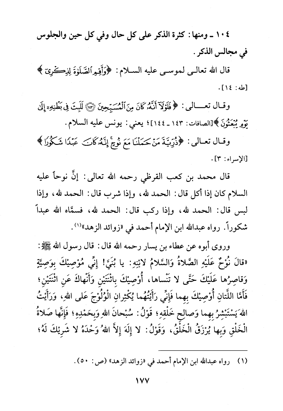 قال محمد بن كعب القرظي رحمه الله تعالى: إنَّ نوحاً عليه السلام كان إذا أكل قال: الحمد لله، وإذا شرب قال: الحمد لله، وإذا لبس قال: الحمد لله، وإذا ركب قال: الحمد لله، فسمَّاه الله عبداً شكوراً. رواه عبد الله ابن الإمام أحمد في "زوائد الزهد" (¬1).