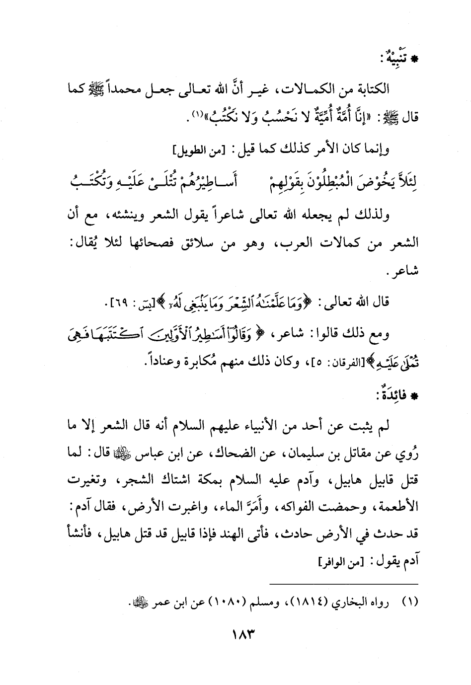 الكتابة من الكمالات، غير أنَّ الله تعالى جعل محمداً - صلى الله عليه وسلم - كما قال - صلى الله عليه وسلم -: "إنَّا أُمَّةٌ أُمِّيَّةٌ لا نَحْسُبُ وَلا نَكْتُبُ" (¬1).