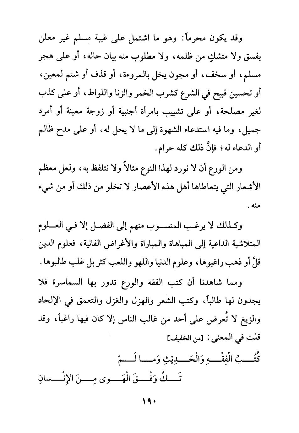 ومما شاهدنا أن كتب الفقه والورع تدور بها السماسرة فلا يجدون لها طالباً، وكتب الشعر والهزل والغزل والتعمق في الإلحاد والزيغ لا تُعرض على أحد من غالب الناس إلا كان فيها راغباً، وقد قلت في المعنى: [من الخفيف]