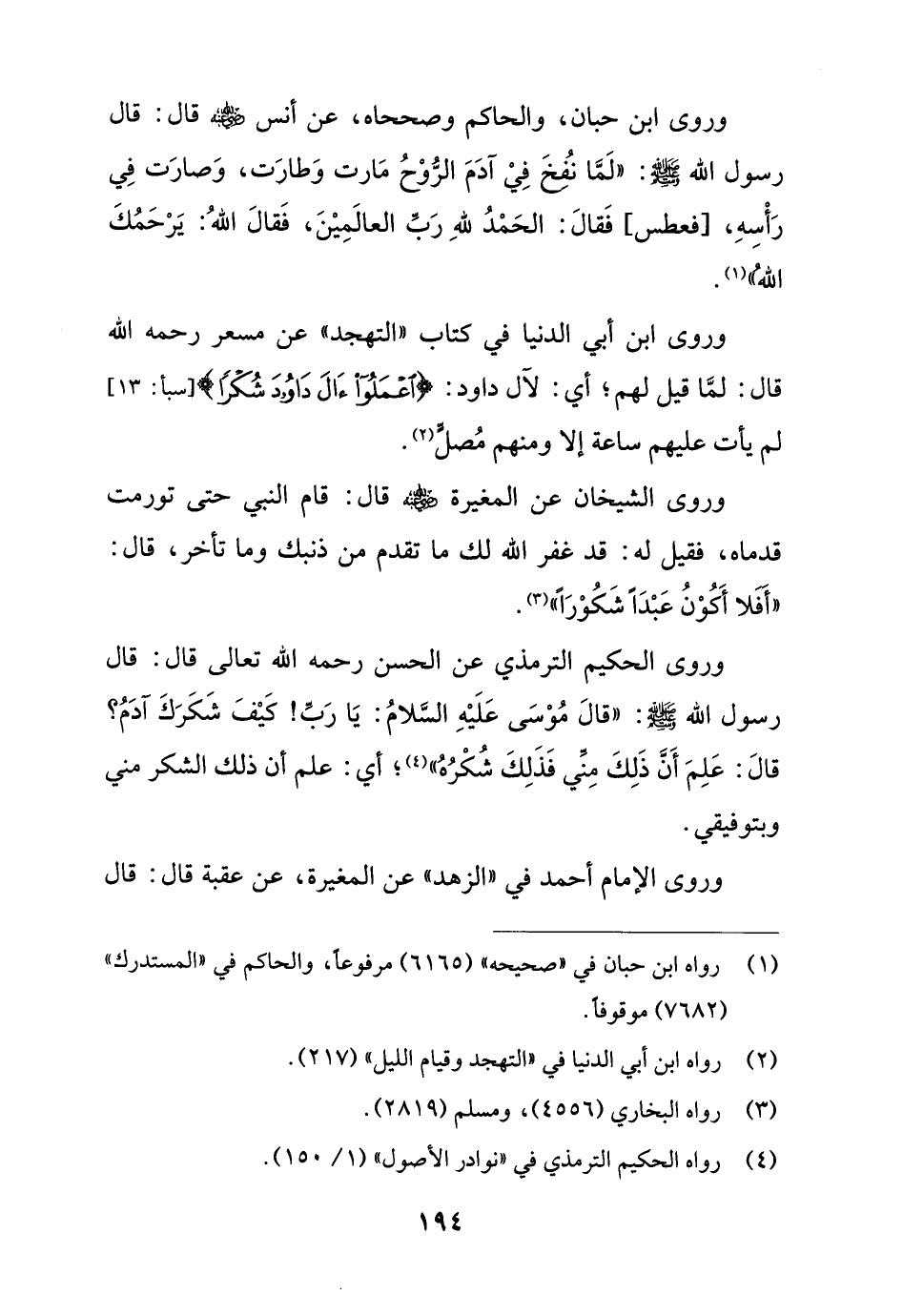 وروى الشيخان عن المغيرة - رضي الله عنه - قال: قام النبي حتى تورمت قدماه، فقيل له: قد غفر الله لك ما تقدم من ذنبك وما تأخر، قال: "أَفَلا أَكُوْنُ عَبْدًا شَكُوْرًا" (¬3).