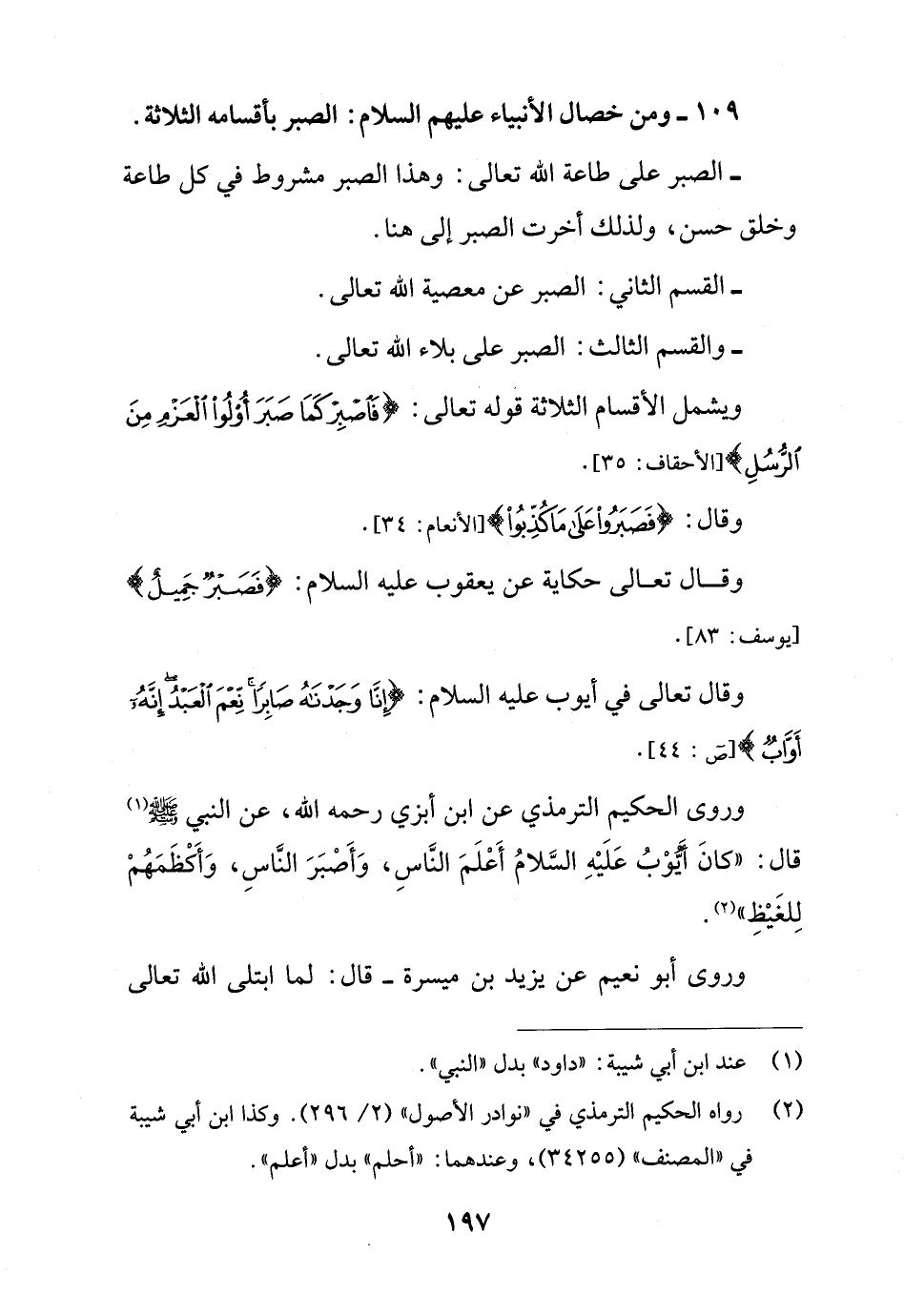 109 - ومن خصال الأنبياء عليهم السلام: الصبر بأقسامه الثلاثة.