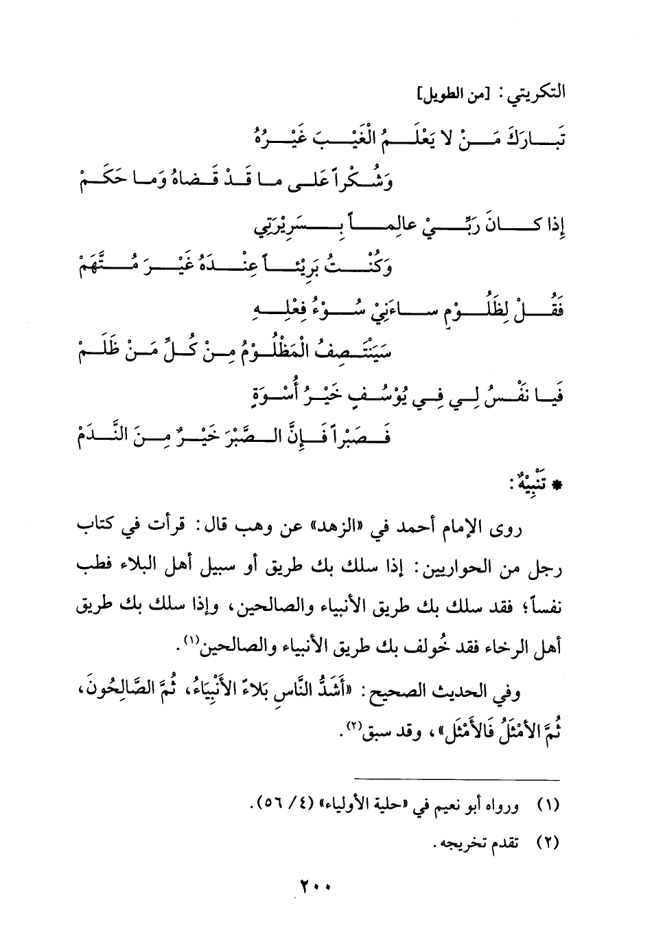 روى الإمام أحمد في "الزهد" عن وهب قال: قرأت في كتاب رجل من الحواريين: إذا سلك بك طريق أو سبيل أهل البلاء فطب نفساً؛ فقد سلك بك طريق الأنبياء والصالحين، وإذا سلك بك طريق أهل الرخاء فقد خُولف بك طريق الأنبياء والصالحين (¬1).