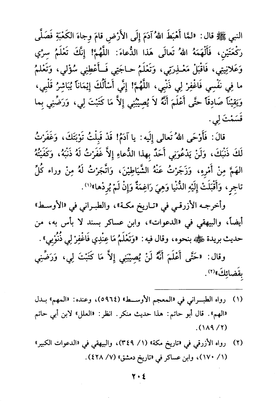النبي - صلى الله عليه وسلم - قال: "لمَّا أَهْبَطَ اللهُ آدَمَ إِلَى الأَرْضِ قامَ وِجاهَ الكَعْبَةِ فَصَلَّى رَكْعَتَيْنِ، فَأَلْهَمَهُ اللهُ تَعالَى هَذا الدُّعاءَ: اللَّهُمَّ! إِنَّكَ تَعْلَمُ سِرِّي وَعَلانِيتِي، فَاقْبَلْ مَعْذِرَتِي، وَتَعْلَمُ حاجَتِي فَأَعْطِنِي سُؤْلي، وَتَعْلمُ ما فِي نَفْسِي فَاغْفِرْ لِي ذَنْبِي، اللَّهُمَّ! إِنَّي أَسْأَلُكَ إِيْمَاناً يُبَاشِرُ قَلْبِي، وَيَقِيْنًا صَادِقًا حتَّى أَعْلَمَ أَنَّهُ لاَ يُصِيْبُنِي إِلاَّ مَا كَتَبْتَ لِي، وَرَضِّنِي بِما قَسَمْتَ لِي.