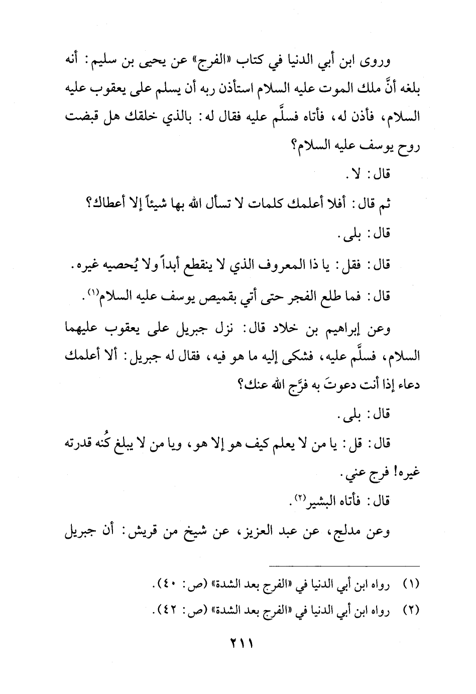 وعن إبراهيم بن خلاد قال: نزل جبريل على يعقوب عليهما السلام، فسلَّم عليه، فشكى إليه ما هو فيه، فقال له جبريل: ألا أعلمك دعاء إذا أنت دعوتَ به فرَّج الله عنك؟