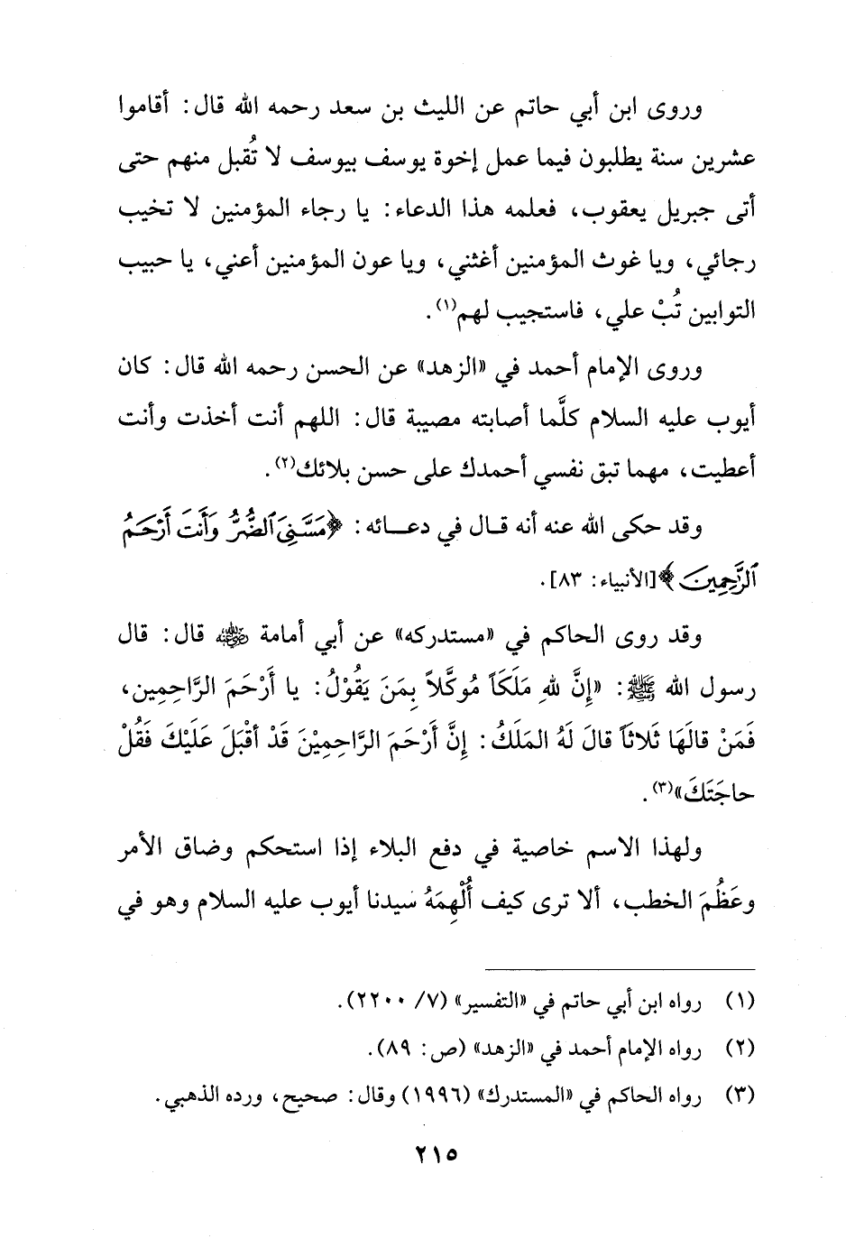 وقد حكى الله عنه أنه قال في دعائه: {مَسَّنِيَ الضُّرُّ وَأَنْتَ أَرْحَمُ الرَّاحِمِينَ} [الأنبياء: 83].