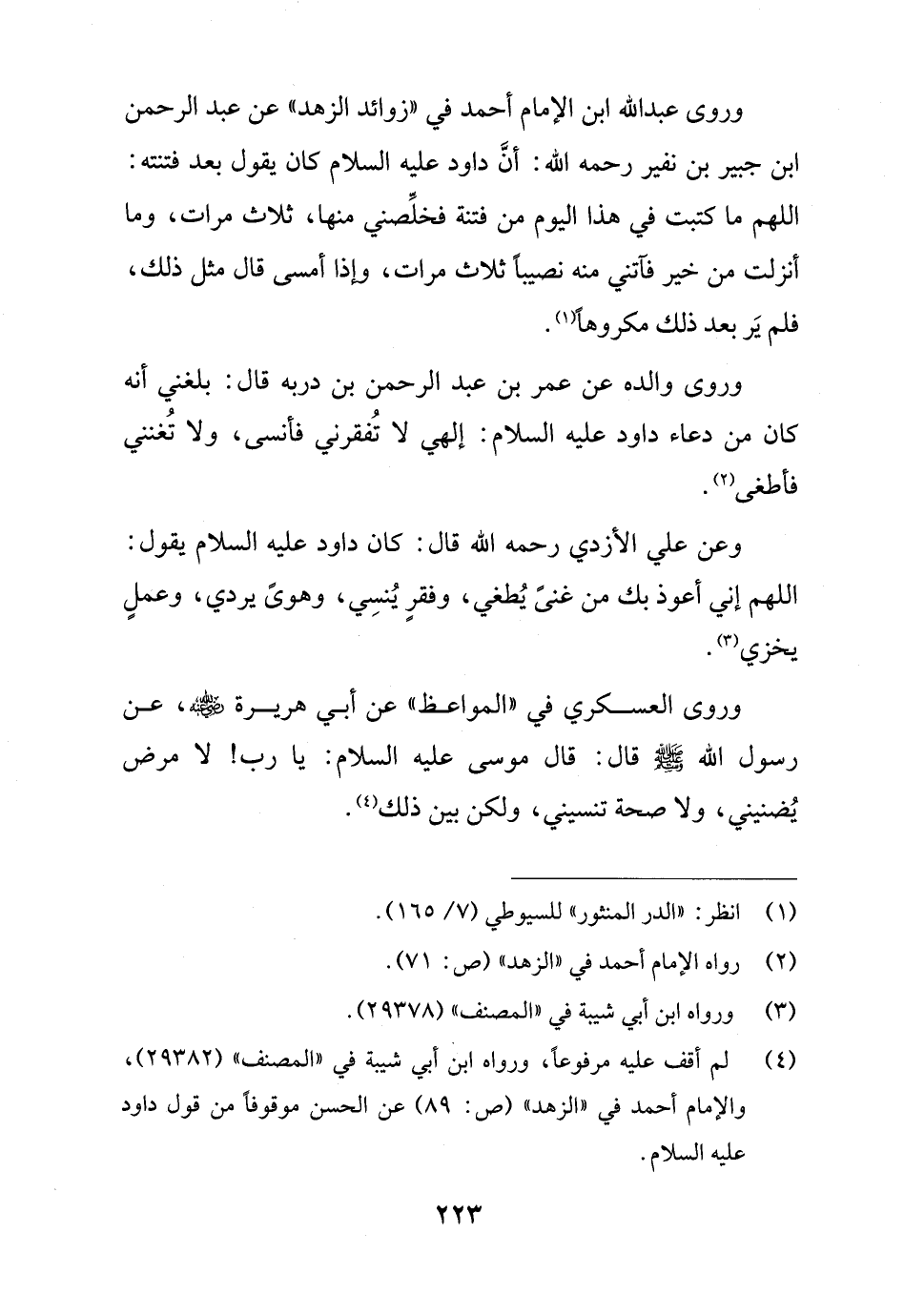 وروى عبد الله ابن الإمام أحمد في "زوائد الزهد" عن عبد الرحمن ابن جبير بن نفير رحمه الله: أنَّ داود عليه السلام كان يقول بعد فتنته: اللهم ما كتبت في هذا اليوم من فتنة فخلِّصني منها، ثلاث مرات، وما أنزلت من خير فآتني منه نصيباً ثلاث مرات، وإذا أمسى قال مثل ذلك، فلم يَر بعد ذلك مكروهاً (¬1).