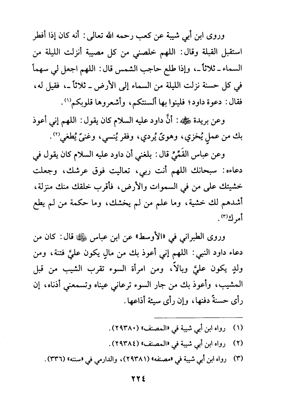 وروى ابن أبي شيبة عن كعب رحمه الله تعالى: أنه كان إذا أفطر استقبل القبلة وقال: اللهم خلصني من كل مصيبة أنزلت الليلة من السماء - ثلاثاً -، وإذا طلع حاجب الشمس قال: اللهم اجعل لي سهماً في كل حسنة نزلت الليلة من السماء إلى الأرض - ثلاثاً -، فقيل له، فقال: دعوة داود؛ فلينوا بها ألسنتكم، وأشعروها قلوبكم (¬1).