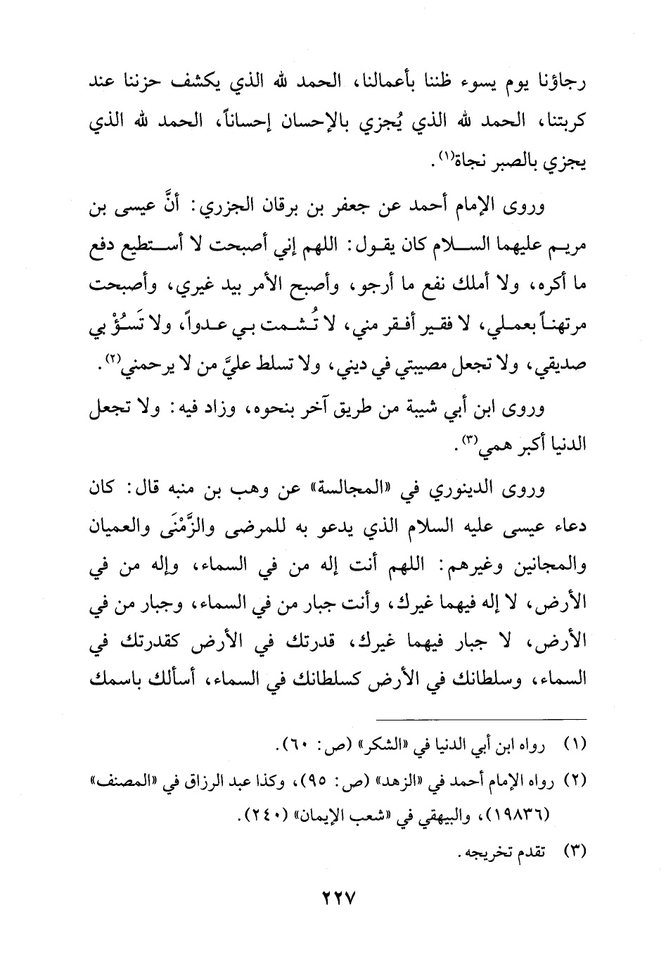 وروى الإمام أحمد عن جعفر بن برقان الجزري: أنَّ عيسى بن مريم عليهما السلام كان يقول: اللهم إني أصبحت لا أستطيع دفع ما أكره، ولا أملك نفع ما أرجو، وأصبح الأمر بيد غيري، وأصبحت مرتهناً بعملي، لا فقير أفقر مني، لا تُشمت بي عدواً، ولا تَسُؤْ بي صديقي، ولا تجعل مصيبتي في ديني، ولا تسلط عليَّ من لا يرحمني (¬2).