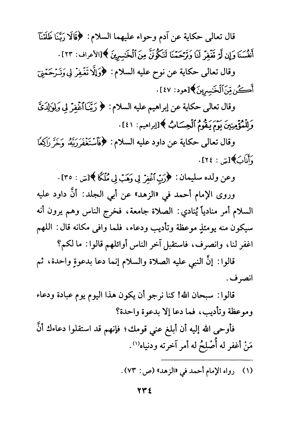 وروى الإمام أحمد في "الزهد" عن أبي الجلد: أنَّ داود عليه السلام أمر منادياً يُنادي: الصلاة جامعة، فخرج الناس وهم يرون أنه سيكون منه يومئذٍ موعظة وتأديب ودعاء، فلما وافى مكانه قال: اللهم اغفر لنا، وانصرف، فاستقبل آخر الناس أوائلهم قالوا: ما لكم؟