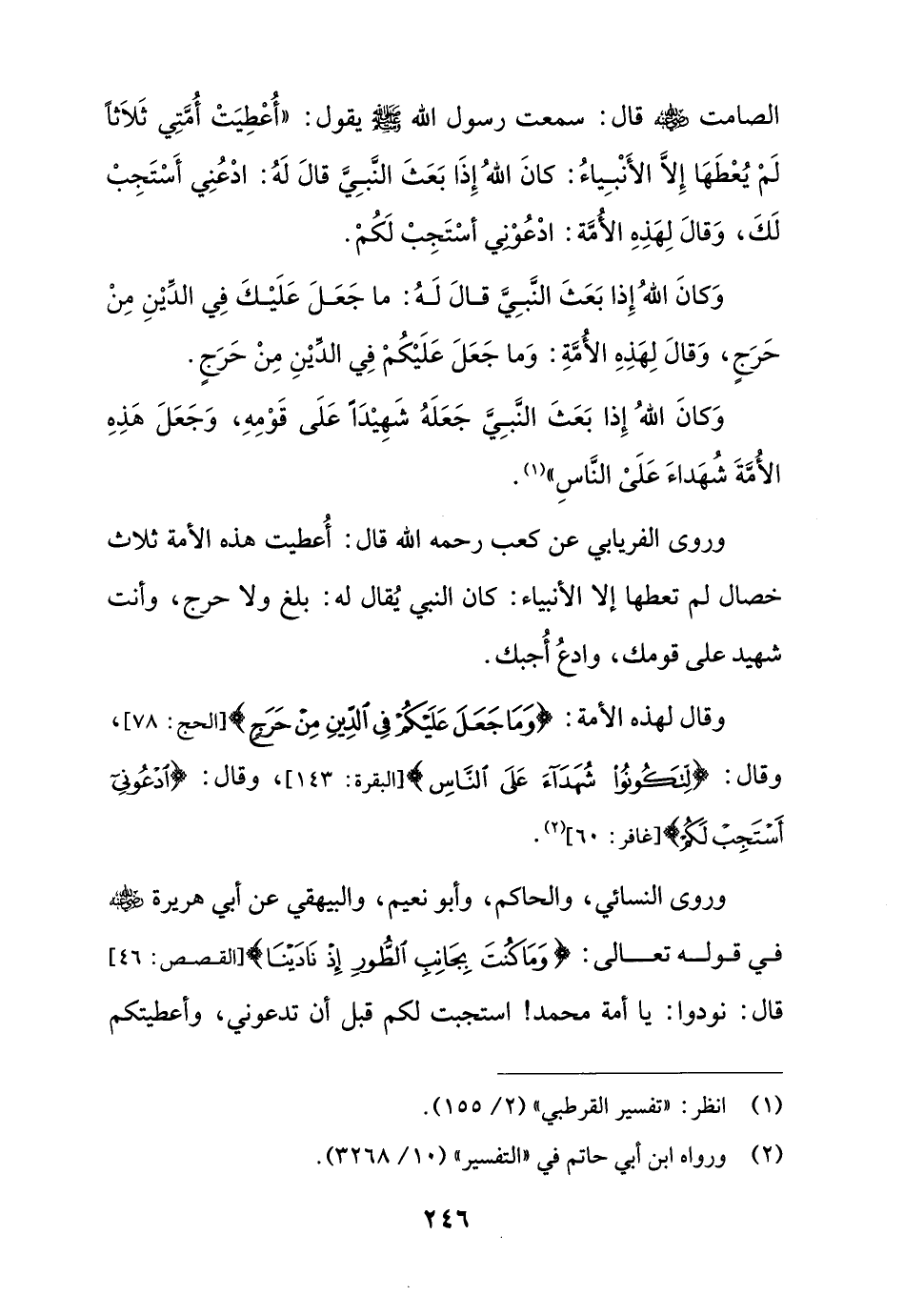 وقال لهذه الأمة: {وَمَا جَعَلَ عَلَيْكُمْ فِي الدِّينِ مِنْ حَرَجٍ} [الحج: 78]، وقال: {لِتَكُونُوا شُهَدَاءَ عَلَى النَّاسِ} [البقرة: 143]، وقال: {ادْعُونِي أَسْتَجِبْ لَكُمْ} [غافر: 60] (¬2).
