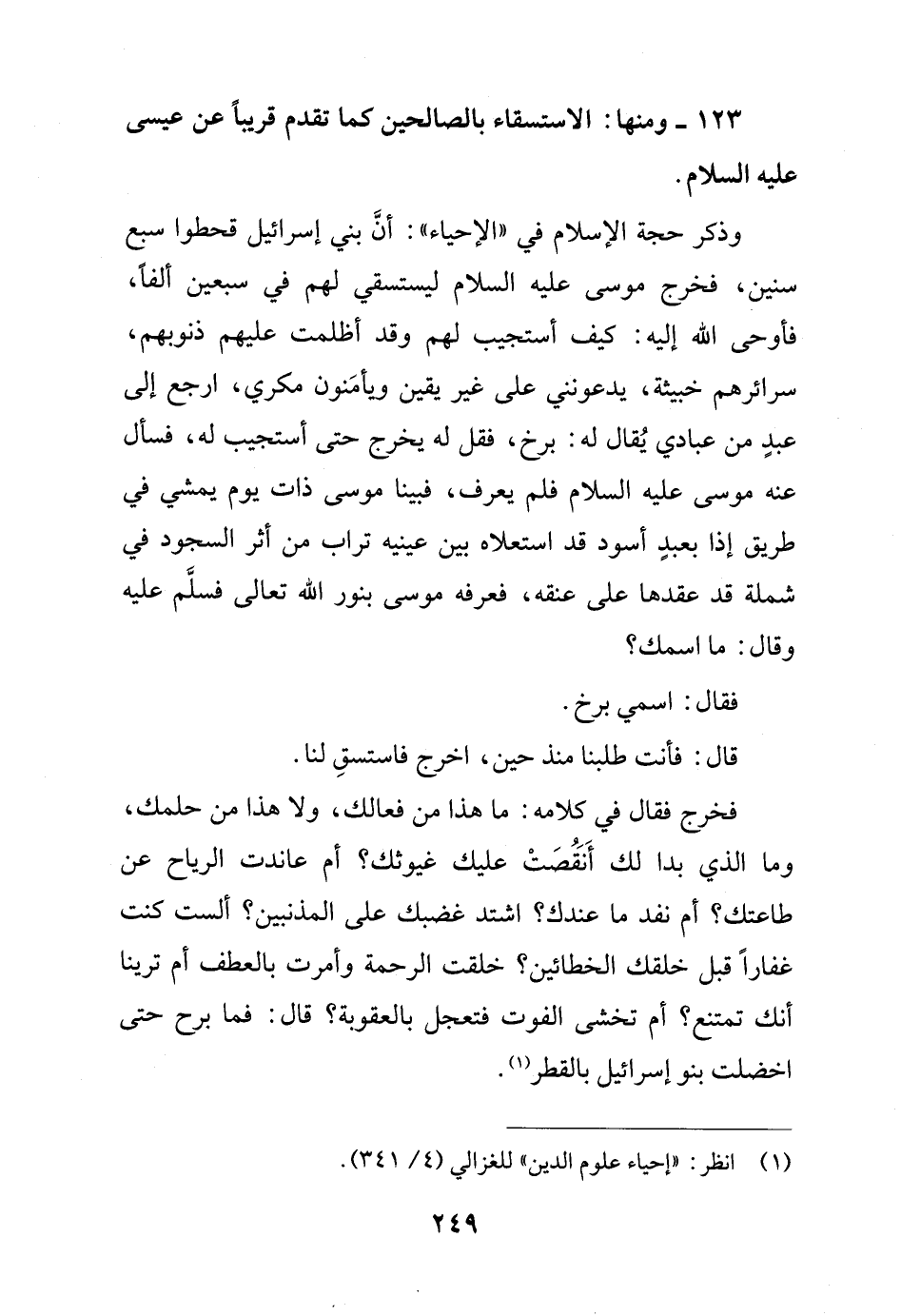 وذكر حجة الإسلام في "الإحياء": أنَّ بني إسرائيل قحطوا سبع سنين، فخرج موسى عليه السلام ليستسقي لهم في سبعين ألفاً، فأوحى الله إليه: كيف أستجيب لهم وقد أظلمت عليهم ذنوبهم، سرائرهم خبيثة، يدعونني على غير يقين ويأمَنون مكري، ارجع إلى عبدٍ من عبادي يُقال له: برخ، فقل له يخرج حتى أستجيب له، فسأل عنه موسى عليه السلام فلم يعرف، فبينا موسى ذات يوم يمشي في طريق إذا بعبدٍ أسود قد استعلاه بين عينيه تراب من أثر السجود في شملة قد عقدها على عنقه، فعرفه موسى بنور الله تعالى فسلَّم عليه وقال: ما اسمك؟