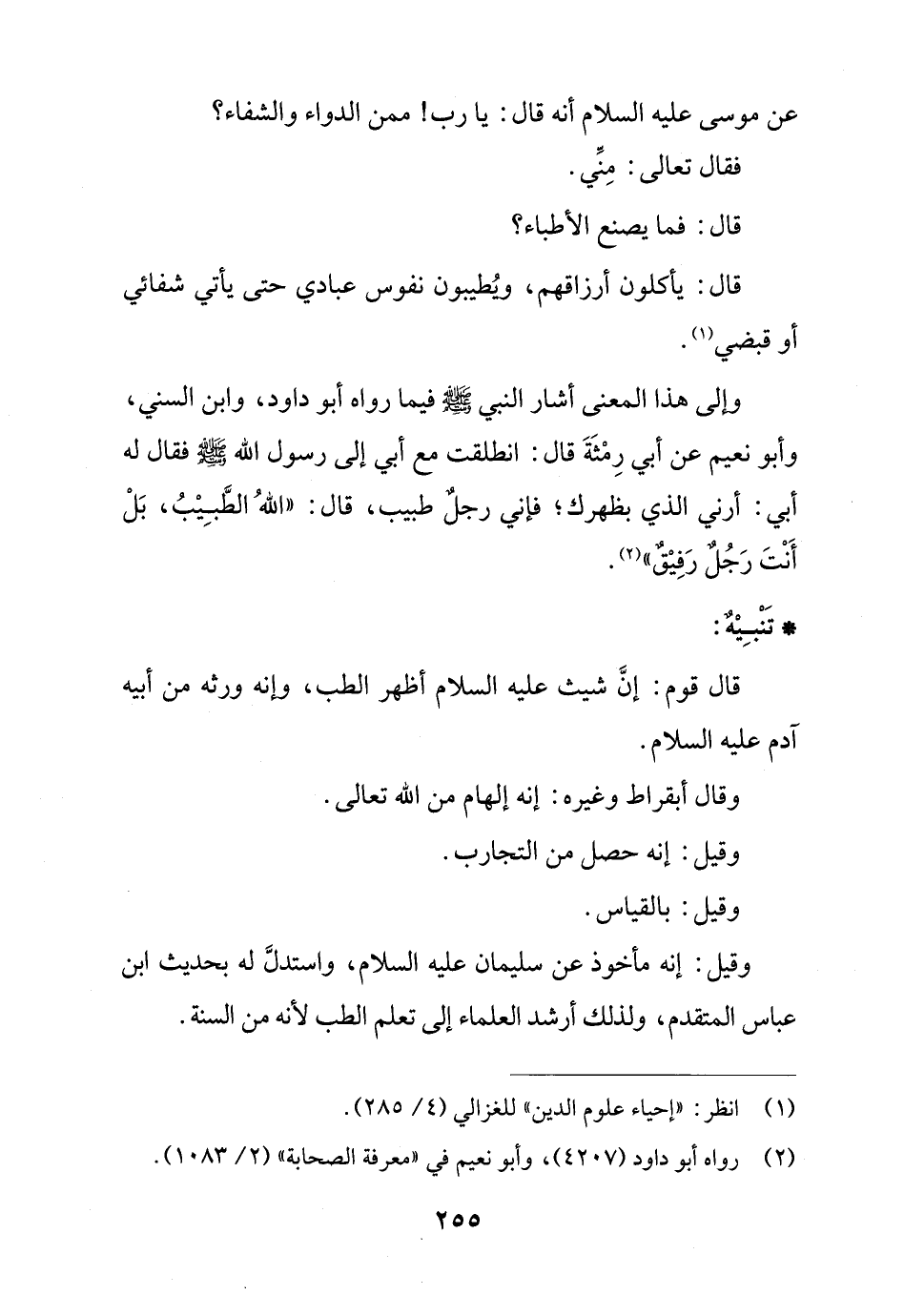 وإلى هذا المعنى أشار النبي - صلى الله عليه وسلم - فيما رواه أَبو داود، وابن السني، وأبو نعيم عن أبي رِمْثَةَ قال: انطلقت مع أبي إلى رسول الله - صلى الله عليه وسلم - فقال له أبي: أرني الذي بظهرك؛ فإني رجلٌ طبيب، قال: "اللهُ الطَّبِيْبُ، بَلْ أَنْتَ رَجُلٌ رَفِيْقٌ" (¬2).