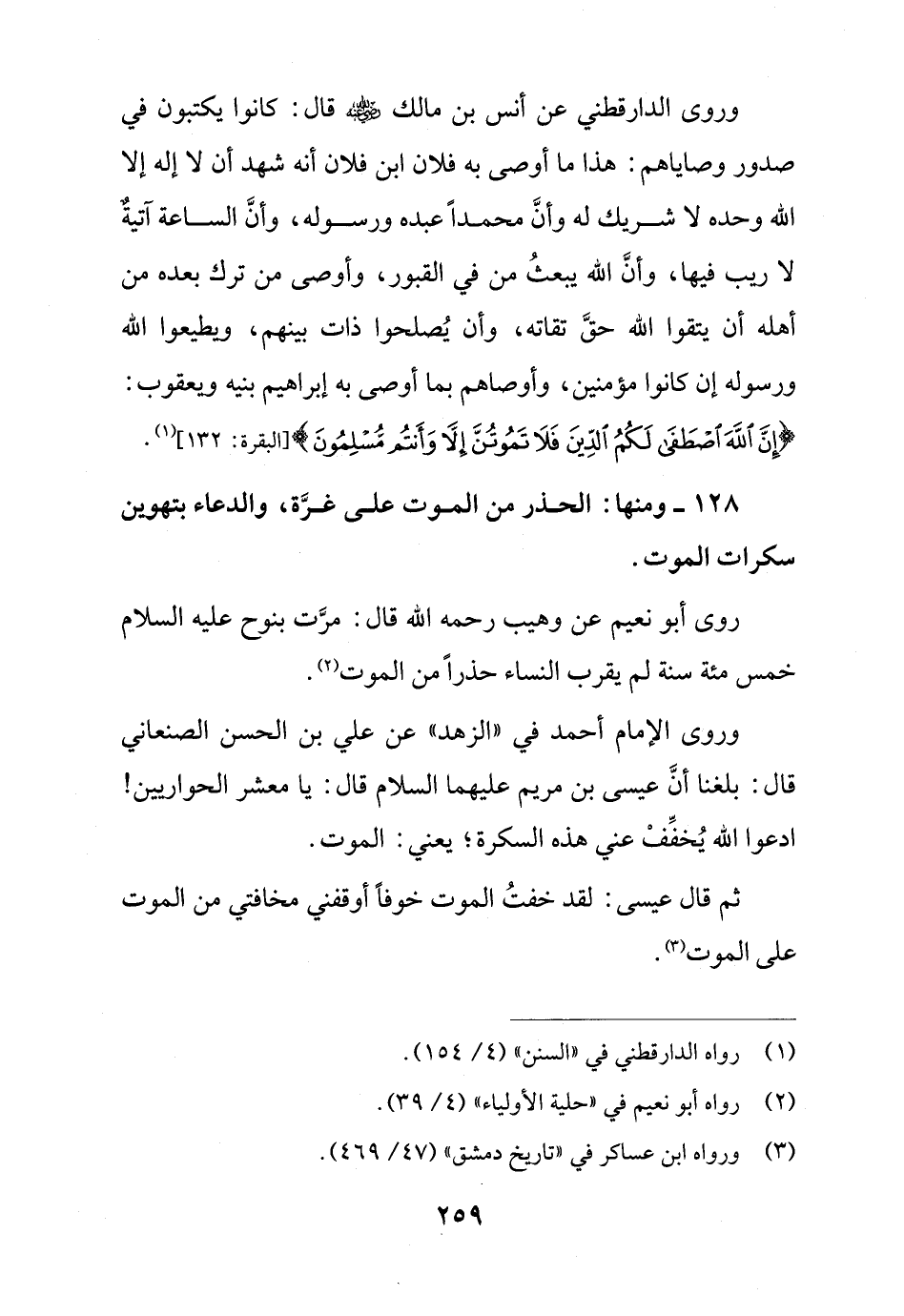 وروى الدارقطني عن أنس بن مالك - رضي الله عنه - قال: كانوا يكتبون في صدور وصاياهم: هذا ما أوصى به فلان ابن فلان أنه شهد أن لا إله إلا الله وحده لا شريك له وأنَّ محمداً عبده ورسوله، وأنَّ الساعة آتيةٌ لا ريب فيها، وأنَّ الله يبعثُ من في القبور، وأوصى من ترك بعده من أهله أن يتقوا الله حقَّ تقاته، وأن يُصلحوا ذات بينهم، ويطيعوا الله ورسوله إن كانوا مؤمنين، وأوصاهم بما أوصى به إبراهيم بنيه ويعقوب: {إِنَّ اللَّهَ اصْطَفَى لَكُمُ الدِّينَ فَلَا تَمُوتُنَّ إِلَّا وَأَنْتُمْ مُسْلِمُونَ} [البقرة: 132] (¬1).