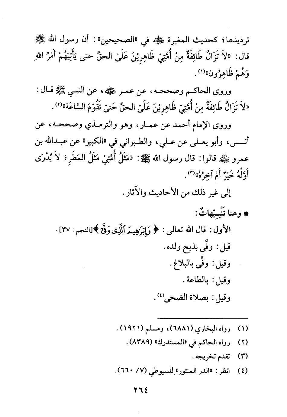 ترديدها؛ كحديث المغيرة - رضي الله عنه - في "الصحيحين": أن رسول الله - صلى الله عليه وسلم - قال: "لاَ تَزَالُ طَائِفَةٌ مِنْ أُمَّتِيْ ظَاهِرِيْنَ عَلَىْ الحقِّ حتى يَأَتِيَهُمْ أَمْرُ اللهِ وَهُمْ ظَاهِرُون" (¬1).
