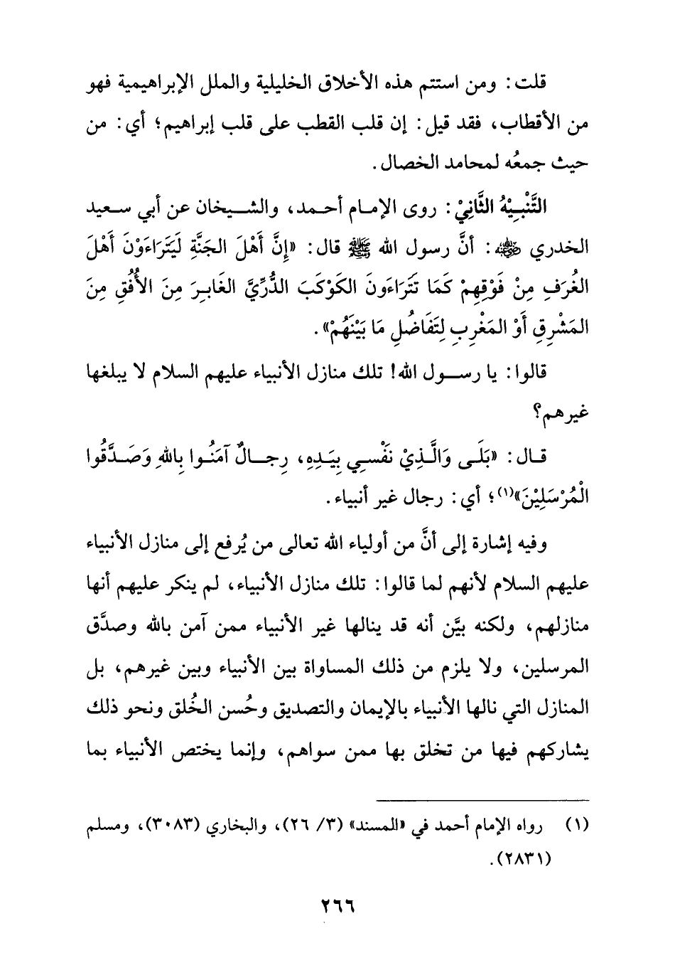 قلت: ومن استتم هذه الأخلاق الخليلية والملل الإبراهيمية فهو من الأقطاب، فقد قيل: إن قلب القطب على قلب إبراهيم؛ أي: من حيث جمعُه لمحامد الخصال.