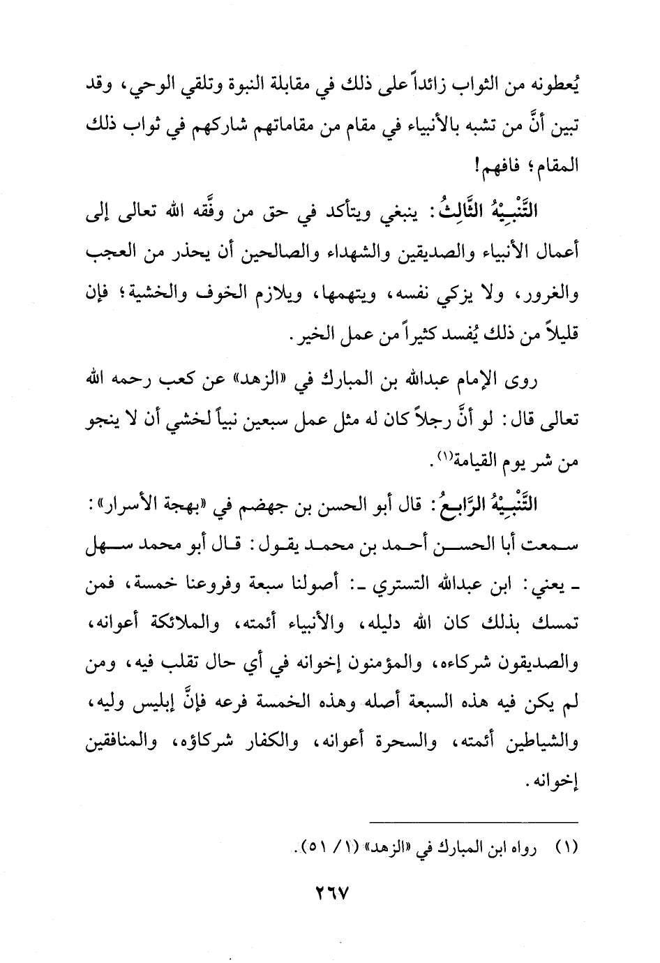 التَّنْبِيْهُ الثَّالِثُ: ينبغي ويتأكد في حق من وفَّقه الله تعالى إلى أعمال الأنبياء والصديقين والشهداء والصالحين أن يحذر من العجب والغرور، ولا يزكي نفسه، ويتهمها، ويلازم الخوف والخشية؛ فإن قليلاً من ذلك يُفسد كثيراً من عمل الخير.