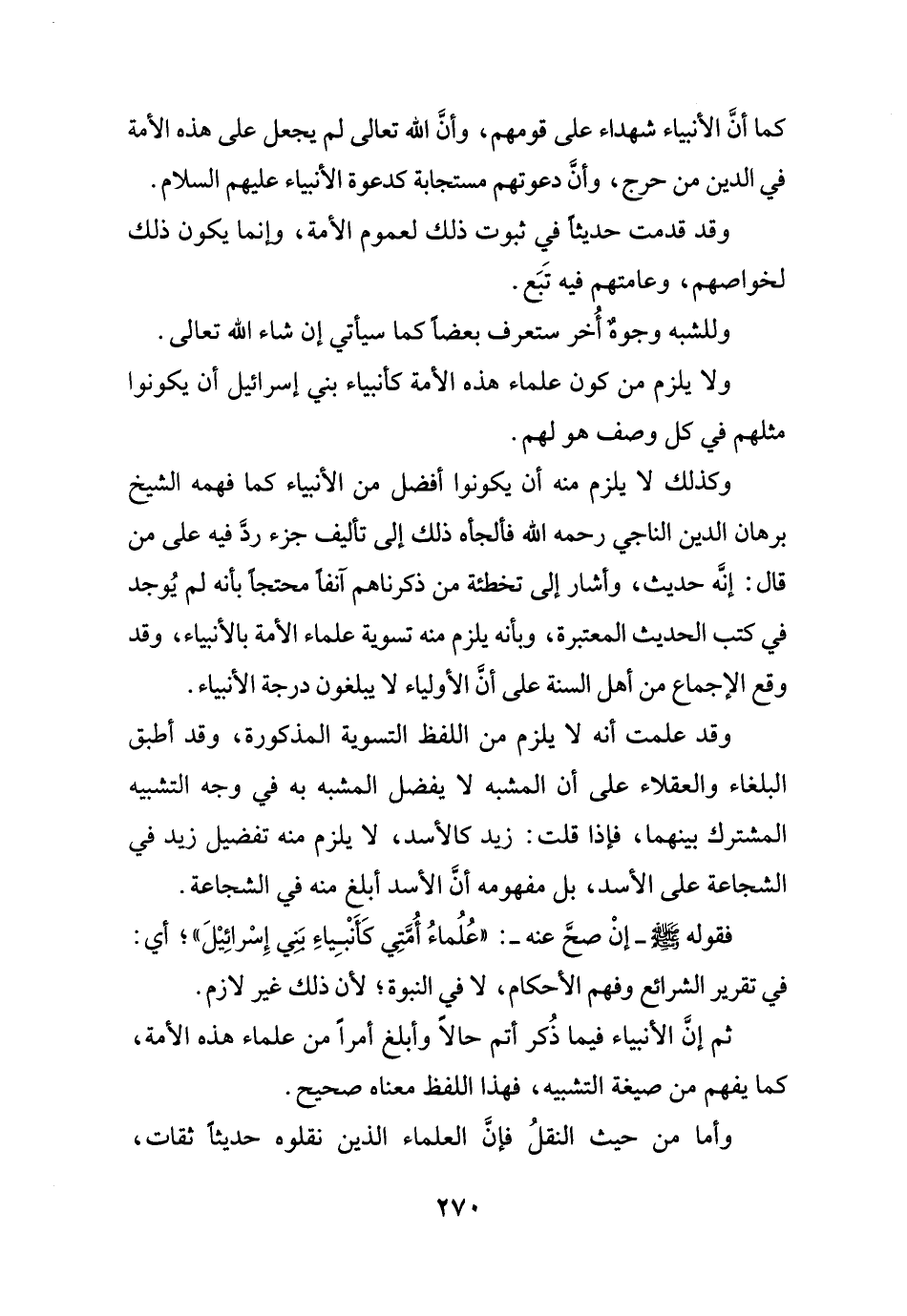 فقوله - صلى الله عليه وسلم - - إنْ صحَّ عنه -: "عُلُماءُ أُمَّتِي كَأَنْبِياءِ بَنِي إِسْرائِيْلَ"؛ أي: في تقرير الشرائع وفهم الأحكام، لا في النبوة؛ لأن ذلك غير لازم.