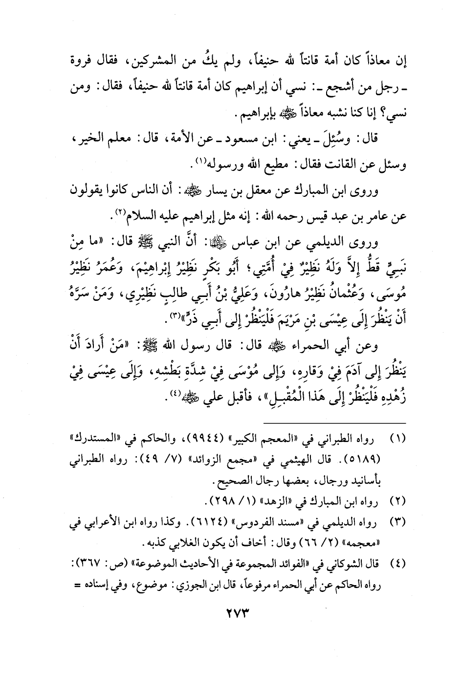 إن معاذاً كان أمة قانتاً لله حنيفاً، ولم يكُ من المشركين، فقال فروة - رجل من أشجع -: نسي أن إبراهيم كان أمة قانتاً لله حنيفاً، فقال: ومن نسي؟ إنا كنا نشبه معاذاً - رضي الله عنه - بإبراهيم.