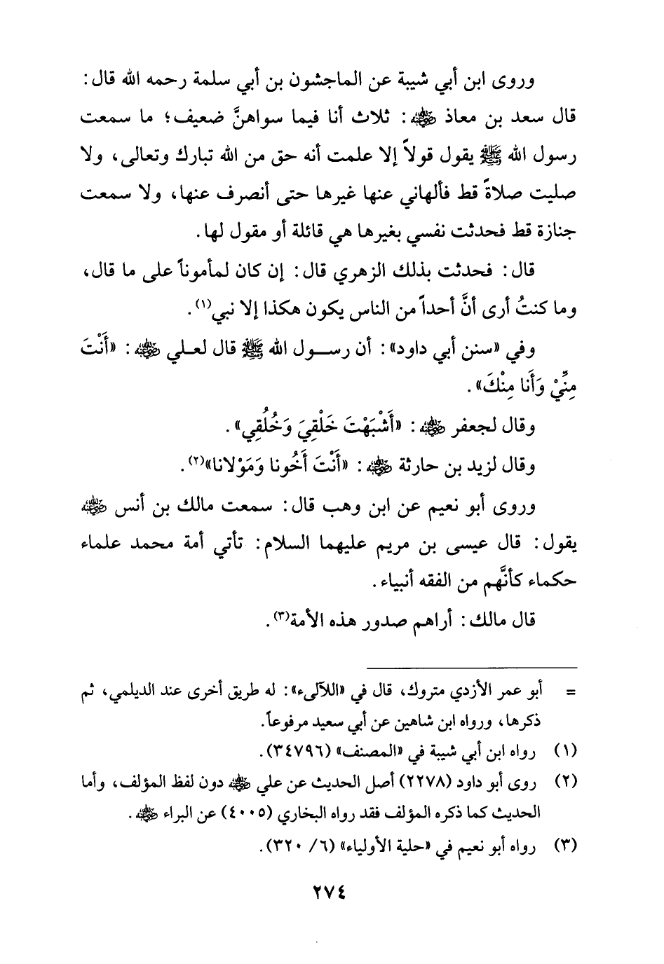 وروى أَبو نعيم عن ابن وهب قال: سمعت مالك بن أنس - رضي الله عنه - يقول: قال عيسى بن مريم عليهما السلام: تأتي أمة محمد علماء حكماء كأنَّهم من الفقه أنبياء.