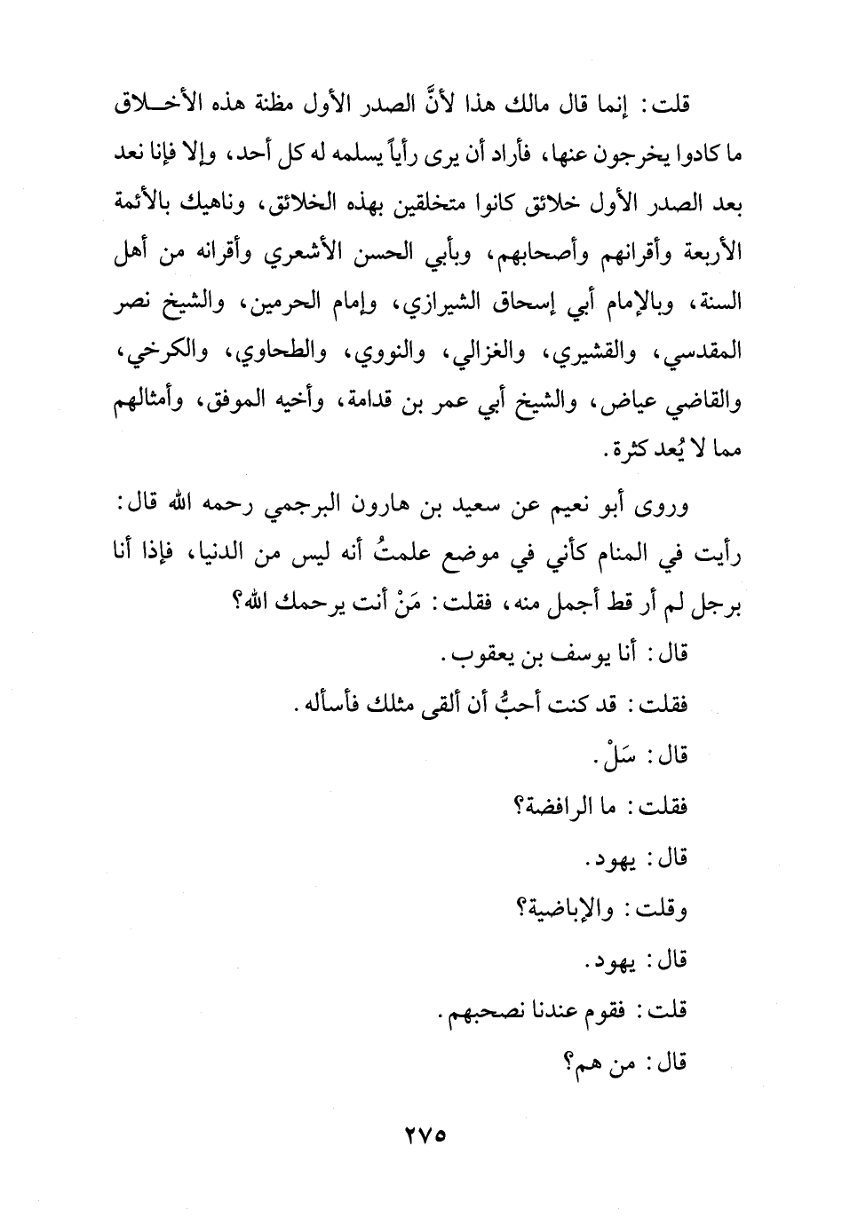 وروى أَبو نعيم عن سعيد بن هارون البرجمي رحمه الله قال: رأيت في المنام كأني في موضع علمتُ أنه ليس من الدنيا، فإذا أنا برجل لم أر قط أجمل منه، فقلت: مَنْ أنت يرحمك الله؟