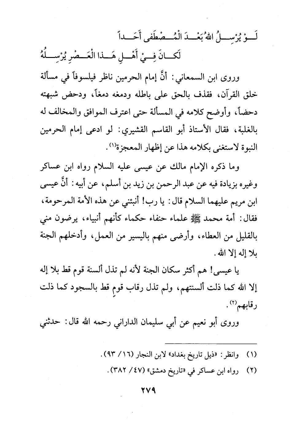 وروى ابن السمعاني: أنَّ إمام الحرمين ناظر فيلسوفاً في مسألة خلق القرآن، فقذف بالحق على باطله ودمغه دمغاً، ودحض شبهته دحضاً، وأوضح كلامه في المسألة حتى اعترف الموافق والمخالف له بالغلبة، فقال الأستاذ أَبو القاسم القشيري: لو ادعى إمام الحرمين النبوة لاستغنى بكلامه هذا عن إظهار المعجزة (¬1).