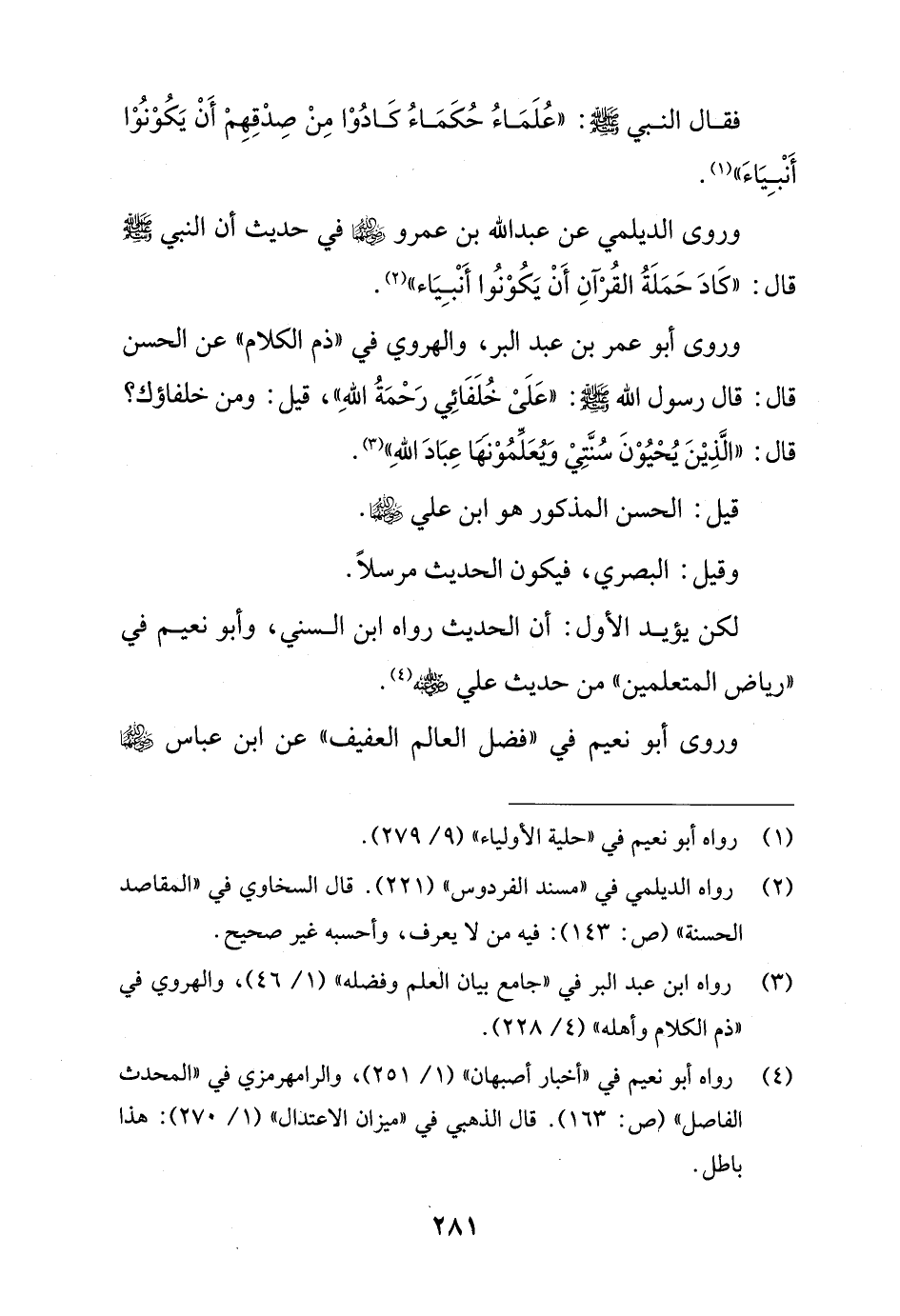وروى أَبو عمر بن عبد البر، والهروي في "ذم الكلام" عن الحسن قال: قال رسول الله - صلى الله عليه وسلم -: "عَلَىْ خُلَفَائِي رَحْمَةُ اللهِ"، قيل: ومن خلفاؤك؟ قال: "الَّذِيْنَ يُحْيُوْنَ سُنَّتِيْ وَيُعَلِّمُوْنها عِبَادَ اللهِ" (¬3).