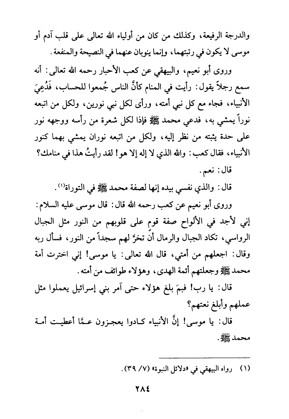 وروى أَبو نعيم، والبيهقي عن كعب الأحبار رحمه الله تعالى: أنه سمع رجلاً يقول: رأيت في المنام كأنَّ الناس جُمعوا للحساب، فَدُعِيَ الأنبياء، فجاء مع كل نبي أمته، ورأى لكل نبي نورين، ولكل من اتبعه نوراً يمشي به، فدعي محمد - صلى الله عليه وسلم - فإذا لكل شعرة من رأسه ووجهه نور على حدة يثبته من نظر إليه، ولكل من اتبعه نوران يمشي بهما كنور الأنبياء، فقال كعب: والله الذي لا إله إلا هو! لقد رأيتُ هذا في منامك؟ قال: نعم.