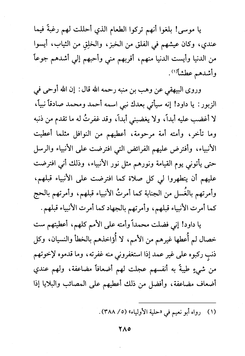 وروى البيهقي عن وهب بن منبه رحمه الله قال: إن الله أوحى في الزبور: يا داود! إنه سيأتي بعدك نبي اسمه أحمد ومحمد صادقاً نبياً، لا أغضب عليه أبداً، ولا يغضبني أبداً، وقد غفرتُ له ما تقدم من ذنبه وما تأخر، وأمته أمة مرحومة، أعطيهم من النوافل مثلما أعطيت الأنبياء، وأفترض عليهم الفرائض التي افترضت على الأنبياء والرسل حتى يأتوني يوم القيامة ونورهم مثل نور الأنبياء، وذلك أني افترضت عليهم أن يتطهروا في كل صلاة كما افترضت على الأنبياء قبلهم، وأمرتهم بالغُسل من الجنابة كما أمرتُ الأنبياء قبلهم، وأمرتهم بالحج كما أمرت الأنبياء قبلهم، وأمرتهم بالجهاد كما أمرت الأنبياء قبلهم.