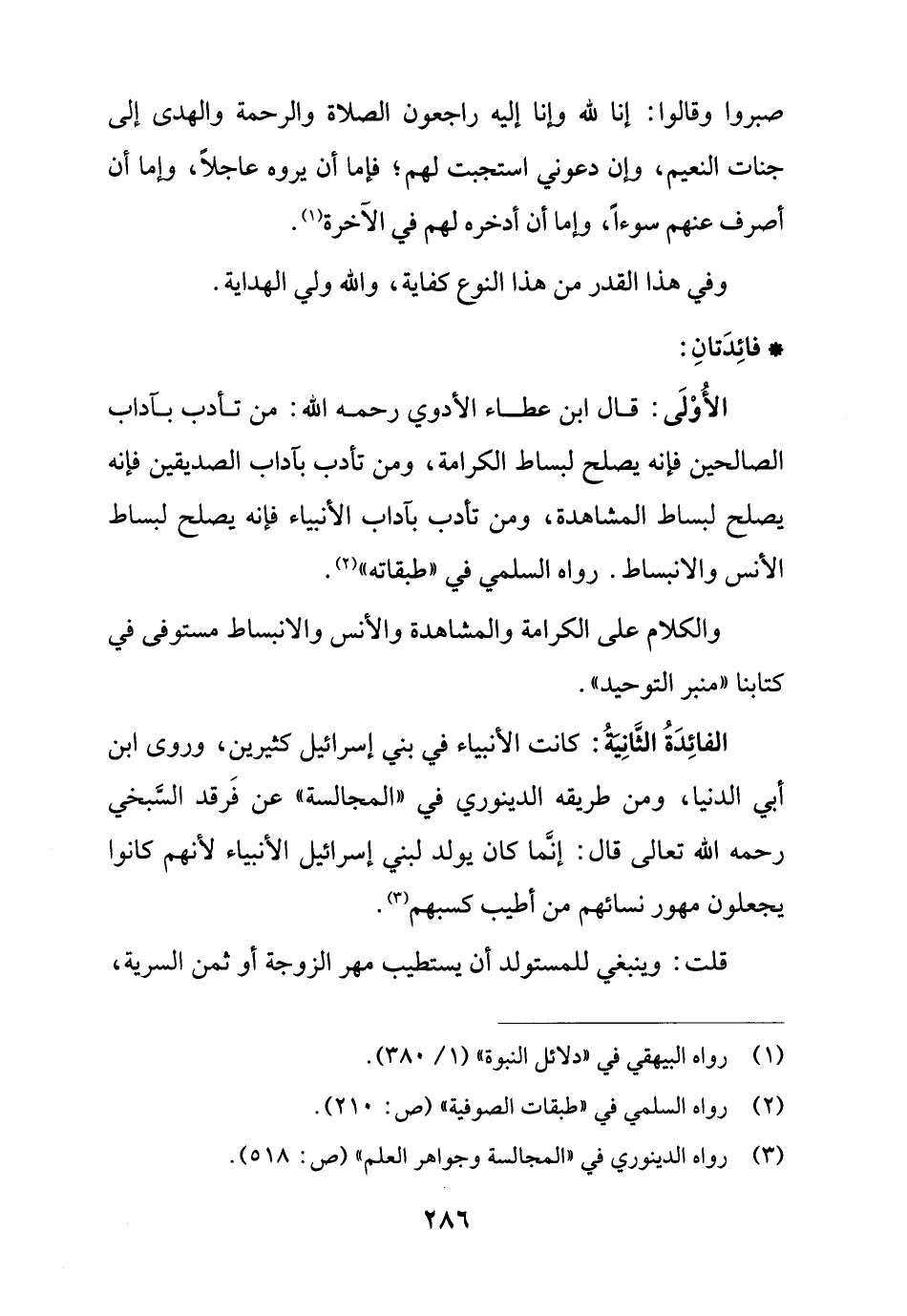 الأُوْلَى: قال ابن عطاء الأدوي رحمه الله: من تأدب بآداب الصالحين فإنه يصلح لبساط الكرامة، ومن تأدب بآداب الصديقين فإنه يصلح لبساط المشاهدة، ومن تأدب بآداب الأنبياء فإنه يصلح لبساط الأنس والانبساط. رواه السلمي في "طبقاته" (¬2).