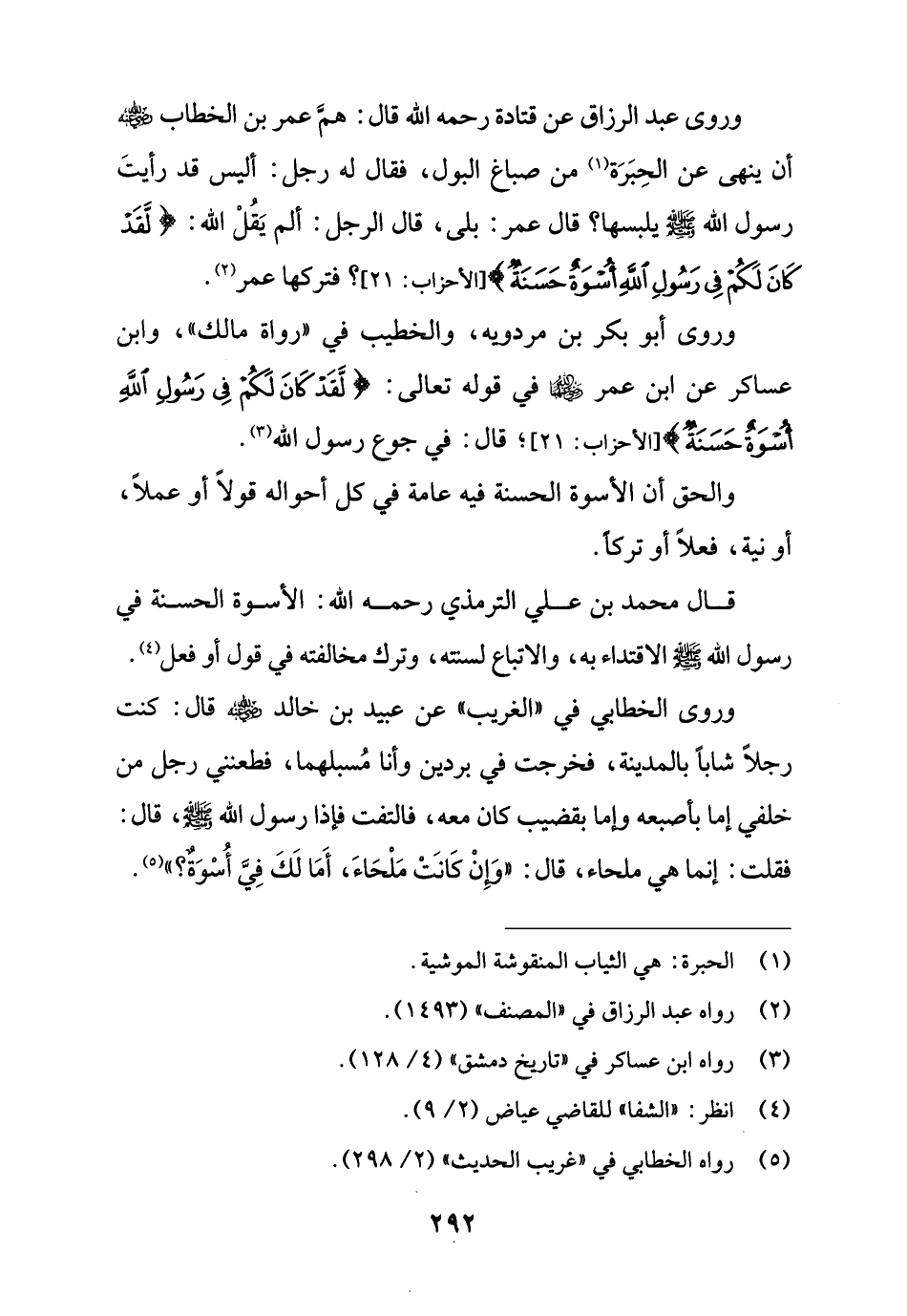 وروى عبد الرزاق عن قتادة رحمه الله قال: همَّ عمر بن الخطاب - رضي الله عنه - أن ينهى عن الحِبَرَة (¬1) من صباغ البول، فقال له رجل: أليس قد رأيتَ رسول الله - صلى الله عليه وسلم - يلبسها؟ قال عمر: بلى، قال الرجل: ألم يَقُلْ الله: {لَقَدْ كَانَ لَكُمْ فِي رَسُولِ اللَّهِ أُسْوَةٌ حَسَنَة} [الأحزاب: 21]؟ فتركها عمر (¬2).
