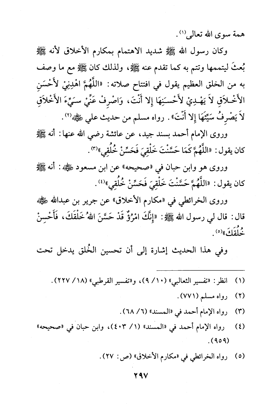 وروى الإمام أحمد بسند جيد، عن عائشة رضي الله عنها: أنه - صلى الله عليه وسلم - كان يقول: "اللَّهُمَّ كَمَا حَسَّنْتَ خَلْقِيَ فَحَسِّنْ خُلُقِي" (¬3).