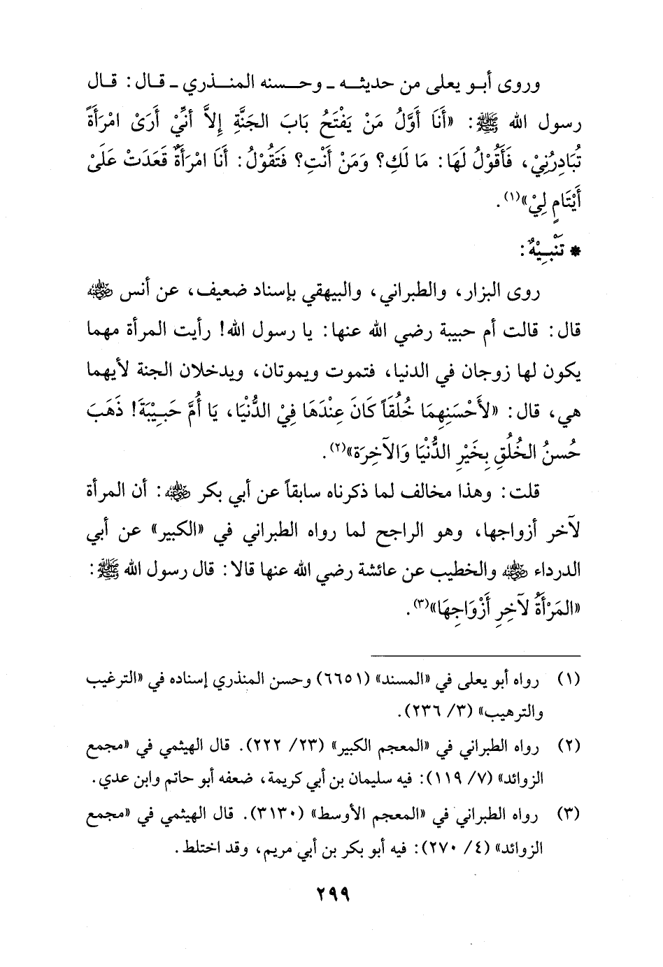 قلت: وهذا مخالف لما ذكرناه سابقاً عن أبي بكر - رضي الله عنه -: أن المرأة لآخر أزواجها، وهو الراجح لما رواه الطبراني في "الكبير" عن أبي الدرداء - رضي الله عنه - والخطيب عن عائشة رضي الله عنها قالا: قال رسول الله - صلى الله عليه وسلم -: "المَرْأَةُ لآخِرِ أَزْوَاجِهَا" (¬3).