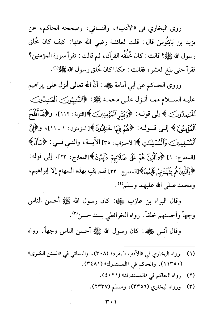 روى البخاري في "الأدب"، والنسائي، وصححه الحاكم، عن يزيد بن بَابَنُوسَ قال: قلت لعائشة رضي الله عنها: كيف كان خُلق رسول الله - صلى الله عليه وسلم -؟ قالت: كان خُلُقُه القرآن، ثم قالت: تقرأ سورة المؤمنين؟ فقرأ حتى بلغ العشر، فقالت: هكذا كان خُلق رسول الله - صلى الله عليه وسلم - (¬1).