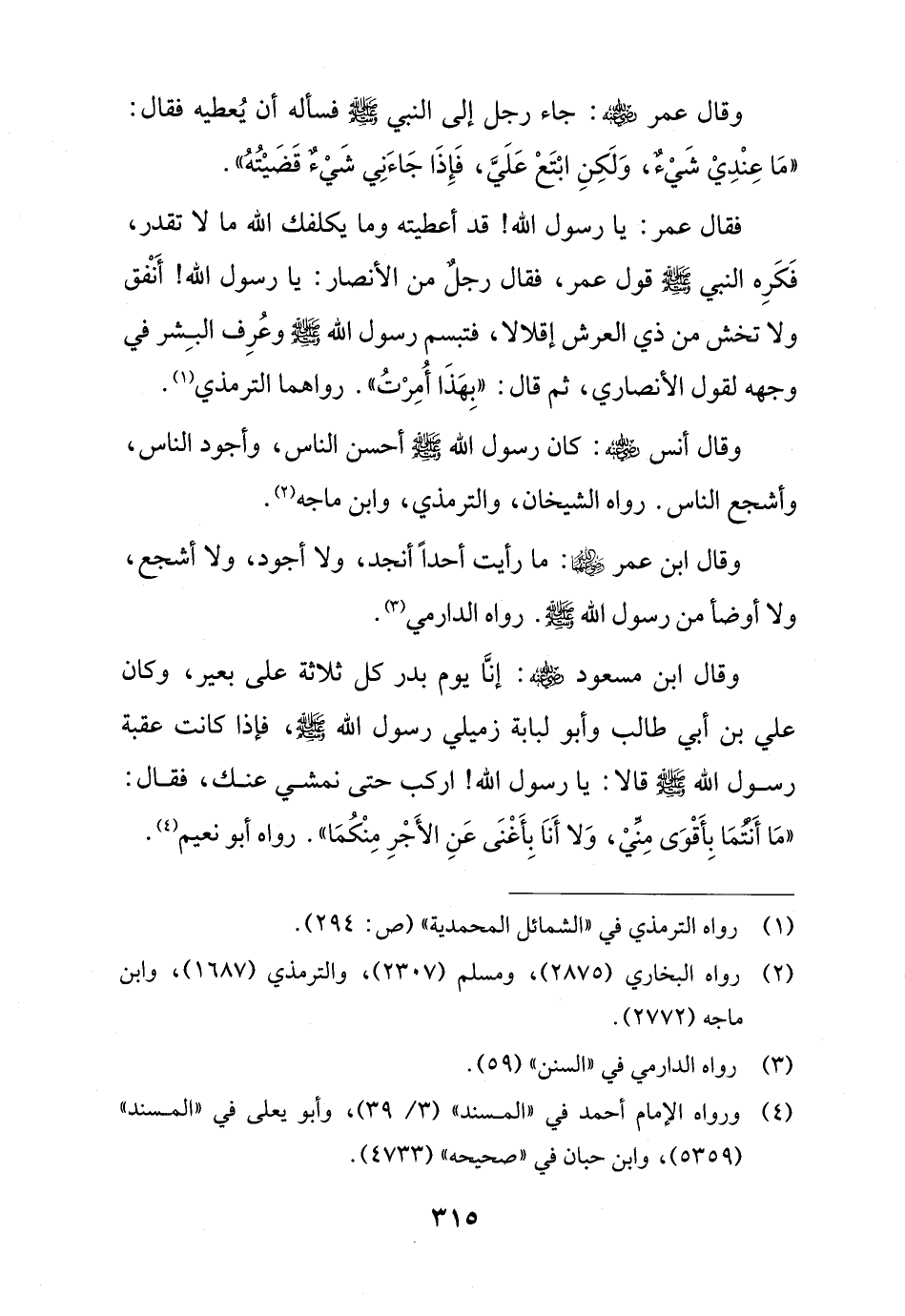 وقال ابن مسعود - رضي الله عنه -: إنَّا يوم بدر كل ثلاثة على بعير، وكان علي بن أبي طالب وأبو لبابة زميلي رسول الله - صلى الله عليه وسلم -، فإذا كانت عقبة رسول الله - صلى الله عليه وسلم - قالا: يا رسول الله! اركب حتى نمشي عنك، فقال: "مَا أَنْتُمَا بِأَقْوَى مِنِّيْ، وَلا أَنَا بِأَغْنَى عَنِ الأَجْرِ مِنْكُمَا". رواه أَبو نعيم (¬4).