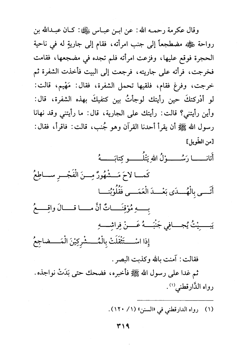 وقال عكرمة رحمه الله: عن ابن عباس - رضي الله عنه -: كان عبد الله بن رواحة - رضي الله عنه - مضطجعاً إلى جنب امرأته، فقام إلى جاريةٍ له في ناحية الحجرة فوقع عليها، وفزعت امرأته فلم تجده في مضجعها، فقامت فخرجت، فرأته على جاريته، فرجعت إلى البيت فأخذت الشفرة ثم خرجت، وفرغ فقام، فلقيها تحمل الشفرة، فقال: مَهْيم، قالت: لو أدْركتكَ حين رأيتك لوجأتُ بين كتفيكَ بهذه الشفرة، قال: وأين رأيتني؟ قالت: رأيتك على الجارية، قال: ما رأيتني وقد نهانا رسول الله - صلى الله عليه وسلم - أن يقرأ أحدنا القرآن وهو جُنب، قالت: فاقرأ، فقال: [من الطّويل]