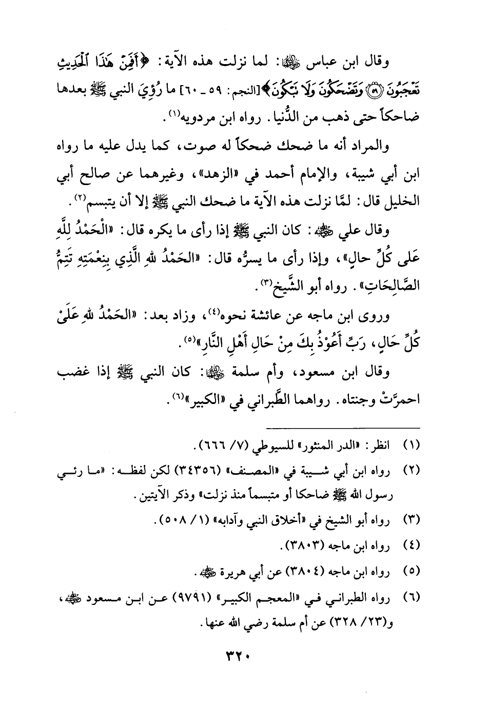 وقال ابن عباس - رضي الله عنهما -: لما نزلت هذه الآية: {أَفَمِنْ هَذَا الْحَدِيثِ تَعْجَبُونَ (59) وَتَضْحَكُونَ وَلَا تَبْكُونَ} [النجم: 59 - 60] ما رُؤِيَ النبي - صلى الله عليه وسلم - بعدها ضاحكاً حتى ذهب من الدُّنيا. رواه ابن مردويه (¬1).