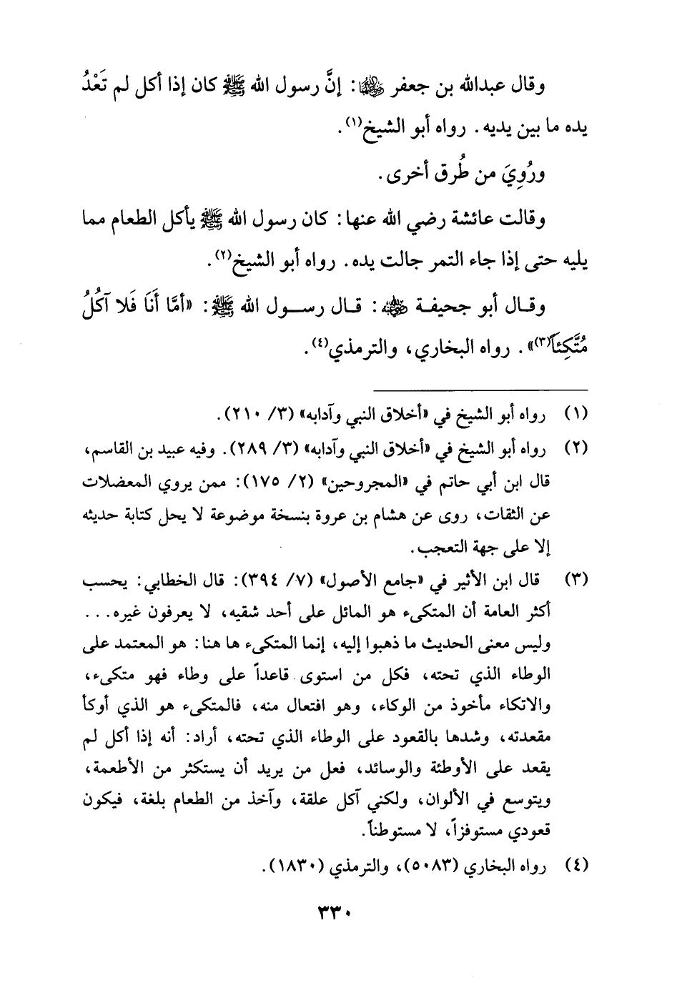 وقال أبو جحيفة - رضي الله عنه -: قال رسول الله - صلى الله عليه وسلم -: "أمَّا أَنَا فَلا آكُلُ مُتَّكِئاً (¬3) ". رواه البخاري، والترمذي (¬4).