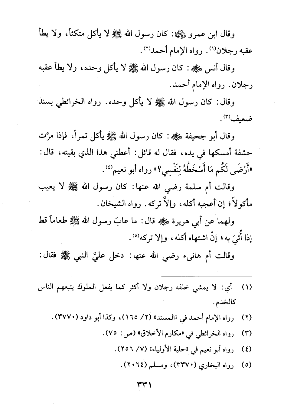 وقال ابن عمرو - رضي الله عنهما -: كان رسول الله - صلى الله عليه وسلم - لا يأكل متكئاً، ولا يطأ عقبه رجلان (¬1). رواه الإمام أحمد (¬2).