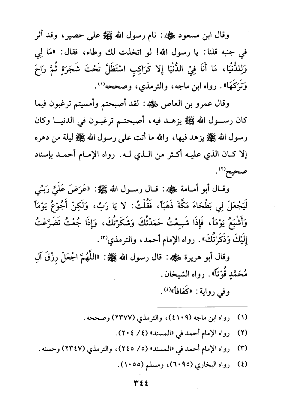 وقال عمرو بن العاص - رضي الله عنه -: لقد أصبحتم وأمسيتم ترغبون فيما كان رسول الله - صلى الله عليه وسلم - يزهد فيه، أصبحتم ترغبون في الدنيا وكان رسول الله - صلى الله عليه وسلم - يزهد فيها، والله ما أتت على رسول الله - صلى الله عليه وسلم - ليلة من دهره إلا كان الذي عليه أكثر من الذي له. رواه الإمام أحمد بإسناد صحيح (¬2).