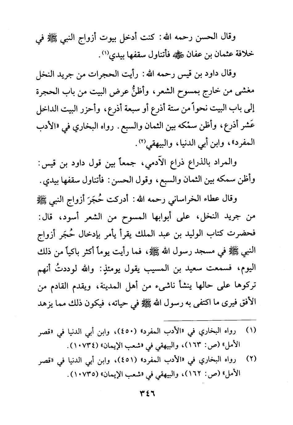وقال داود بن قيس رحمه الله: رأيت الحجرات من جريد النخل مغشى من خارج بمسوح الشعر، وأظنُّ عرض البيت من باب الحجرة إلى باب البيت نحواً من ستة أذرع أو سبعة أذرع، وأحزر البيت الداخل عَشر أذرع، وأظن سمْكه بين الثمان والسبع. رواه البخاري في "الأدب المفرد"، وابن أبي الدنيا، والبيهقي (¬2).