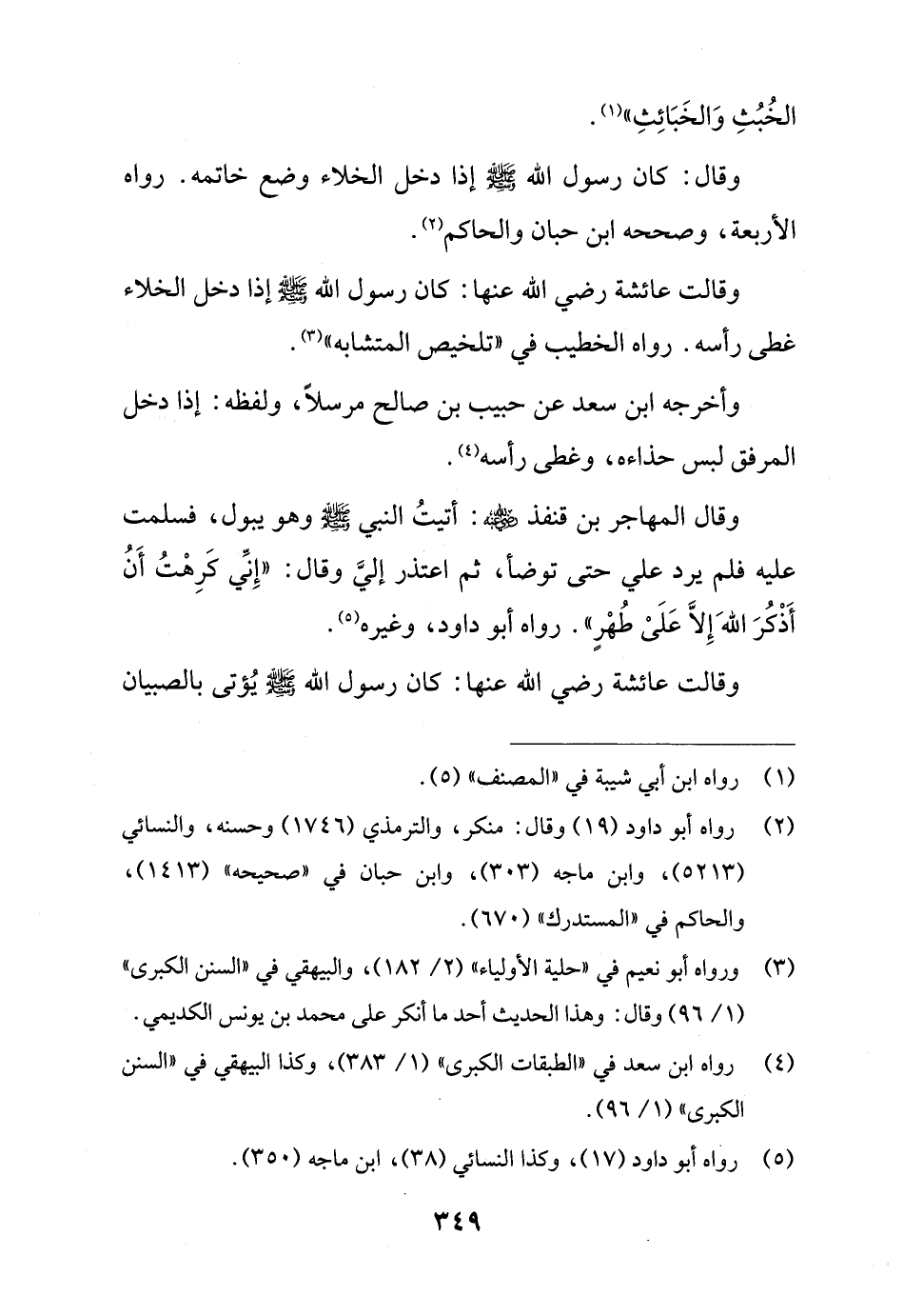 وقالت عائشة رضي الله عنها: كان رسول الله - صلى الله عليه وسلم - إذا دخل الخلاء غطى رأسه. رواه الخطيب في "تلخيص المتشابه" (¬3).