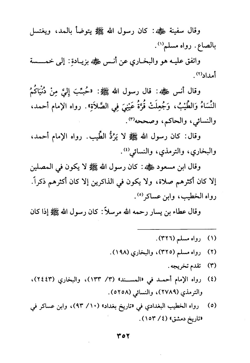 وقال أنس - رضي الله عنه -: قال رسول الله - صلى الله عليه وسلم -: "حُبِّبَ إِليَّ مِنْ دُنْيَاكُمُ النِّسَاءُ وَالطِّيْبُ، وَجُعِلَتْ قرَّةُ عَيْنِيَ فِي الصَّلاَةِ". رواه الإمام أحمد، والنسائي، والحاكم، وصححه (¬3).