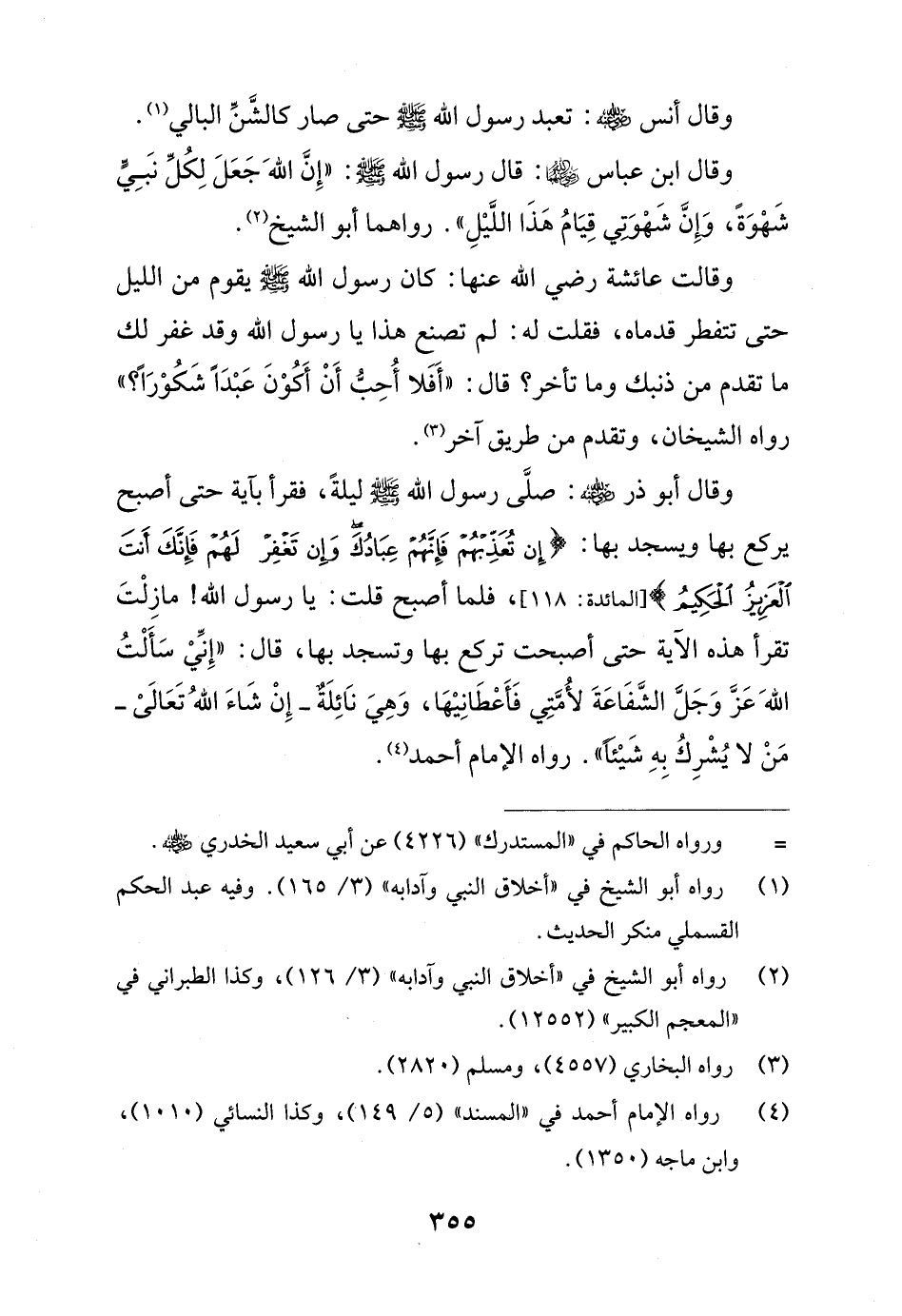 وقال ابن عباس - رضي الله عنهما -: قال رسول الله - صلى الله عليه وسلم -: ، إِنَّ اللهَ جَعَلَ لِكُلِّ نبيٍّ شَهْوَةً، وإِنَّ شَهْوَتِي قِيَامُ هَذَا اللَّيْلِ". رواهما أبو الشيخ (¬2).