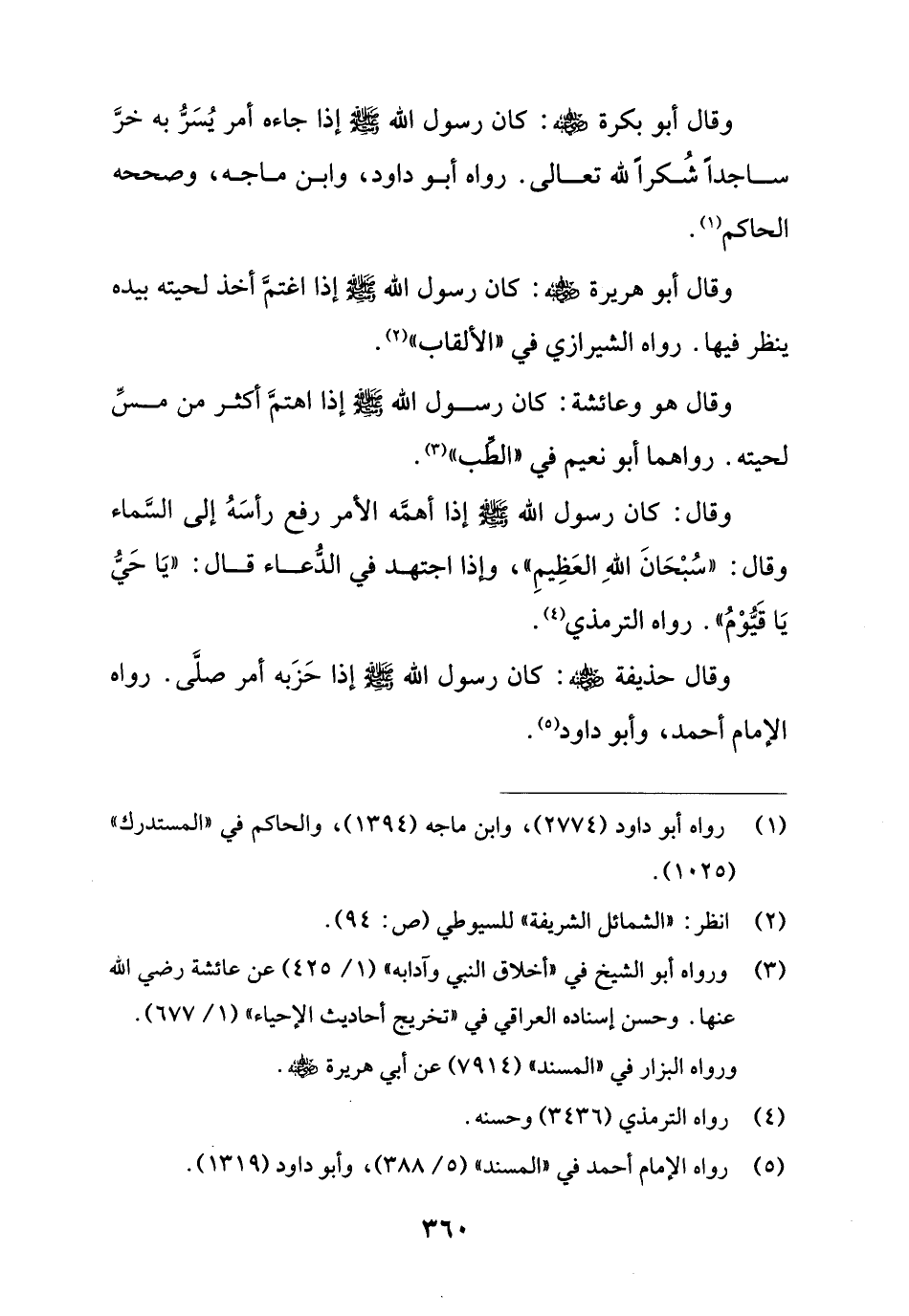 وقال حذيفة - رضي الله عنه -: كان رسول الله - صلى الله عليه وسلم - إذا حَزَبه أمر صلَّى. رواه الإمام أحمد، وأبو داود (¬5).