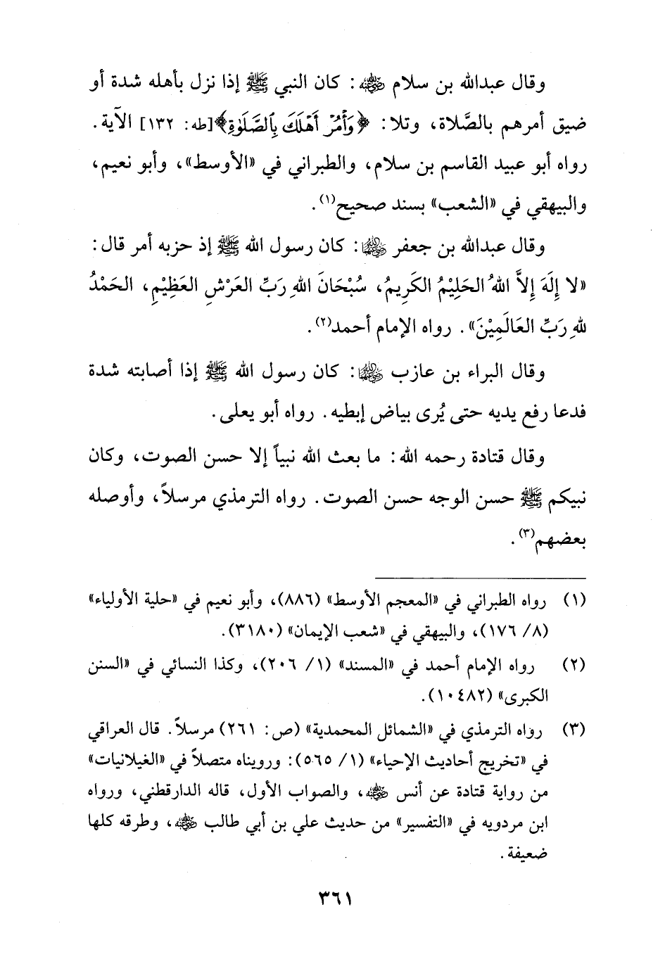 وقال عبد الله بن سلام - رضي الله عنه -: كان النبي - صلى الله عليه وسلم - إذا نزل بأهله شدة أو ضيق أمرهم بالصَّلاة، وتلا: {وَأْمُرْ أَهْلَكَ بِالصَّلَاةِ} [طه: 132] الآية.