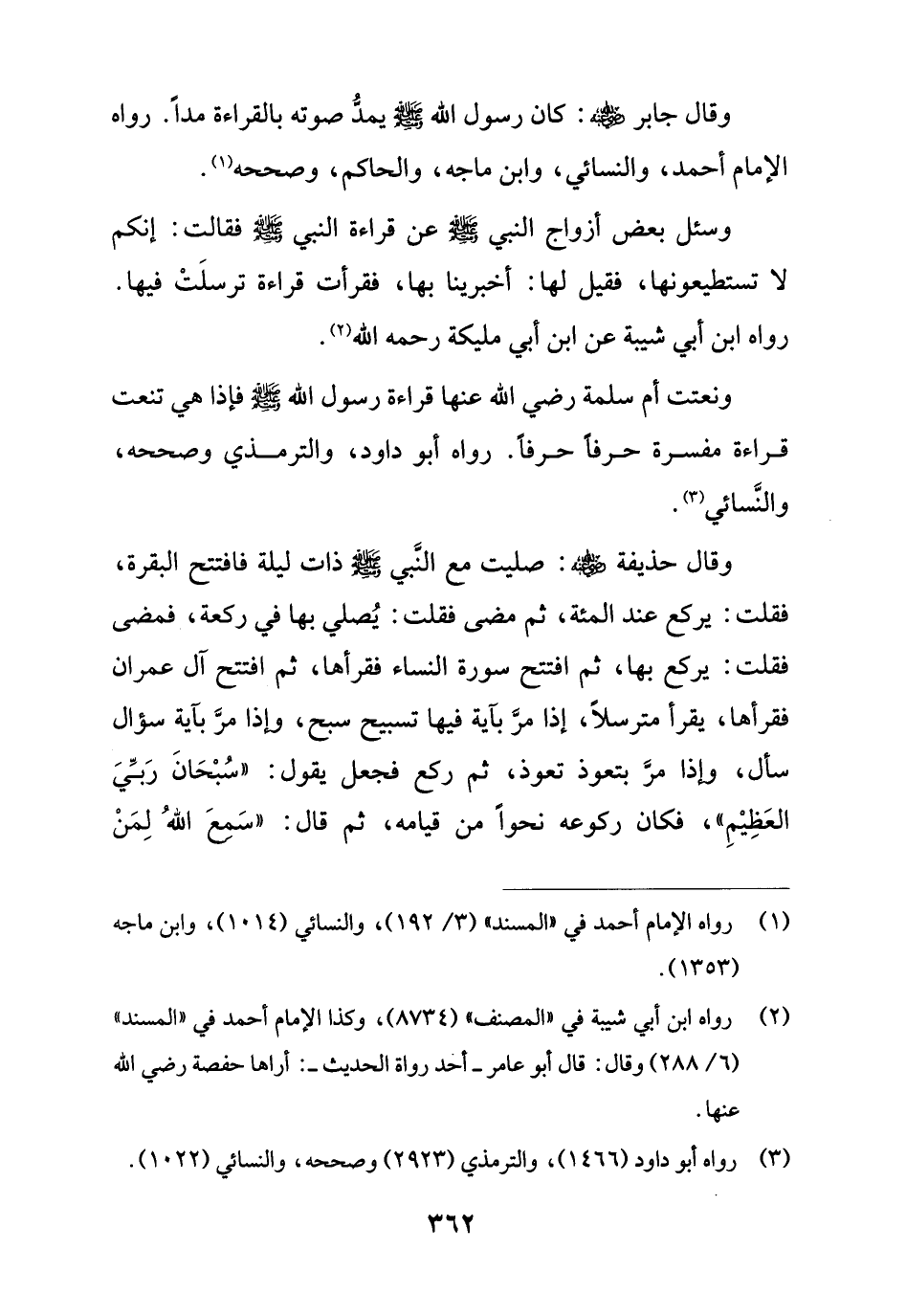 ونعتت أم سلمة رضي الله عنها قراءة رسول الله - صلى الله عليه وسلم - فإذا هي تنعت قراءة مفسرة حرفاً حرفاً. رواه أبو داود، والترمذي وصححه، والنَّسائي (¬3).