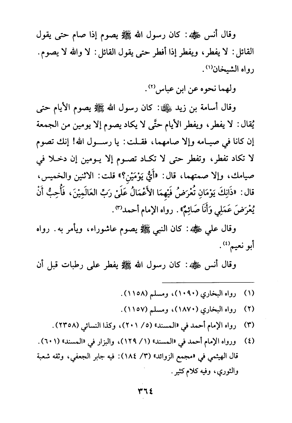 وقال أنس - رضي الله عنه -: كان رسول الله - صلى الله عليه وسلم - يصوم إذا صام حتى يقول القائل: لا يفطر، ويفطر إذا أفطر حتى يقول القائل: لا والله لا يصوم. رواه الشيخان (¬1).